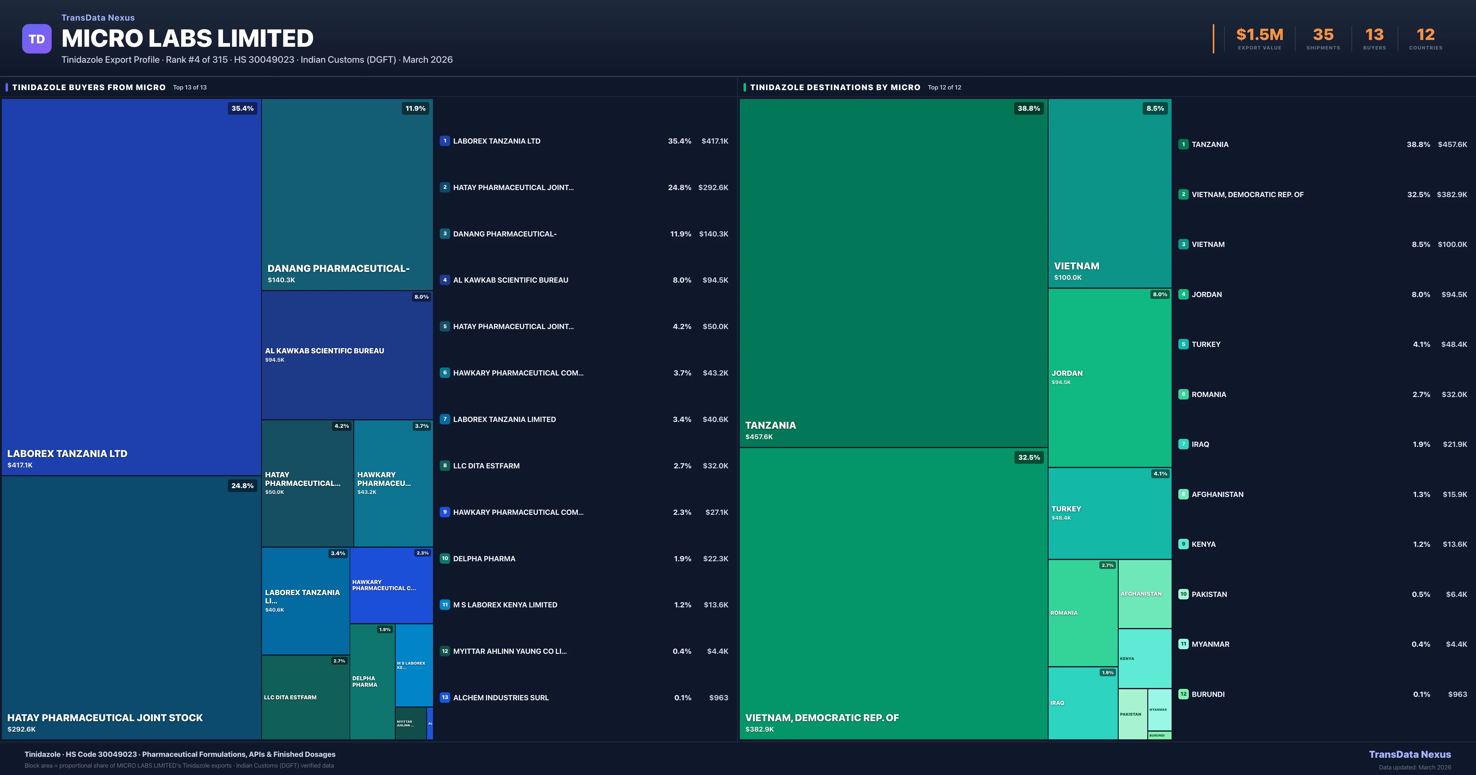 - 4.Verified Records: This page is backed by 35 individual customs records matching Micro Labs Limited exporting Tinidazole, covering 31 formulations to 12 countries via 13 buyers.