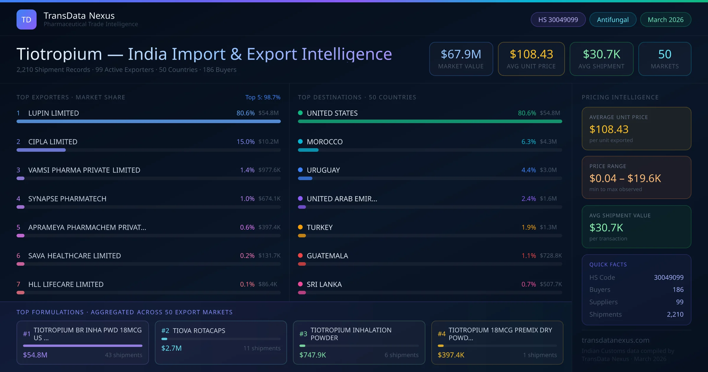 Between 2022 and 2026, India exported $67.9M worth of tiotropium across 2,210 verified shipments to 50 countries — covering 26% of world markets in the Respiratory & OTC segment. The largest destination is UNITED STATES (80.6%). LUPIN LIMITED leads with a 80.6% share. All figures are drawn from Indian Customs (DGFT) shipping bill records spanning four years of trade activity.