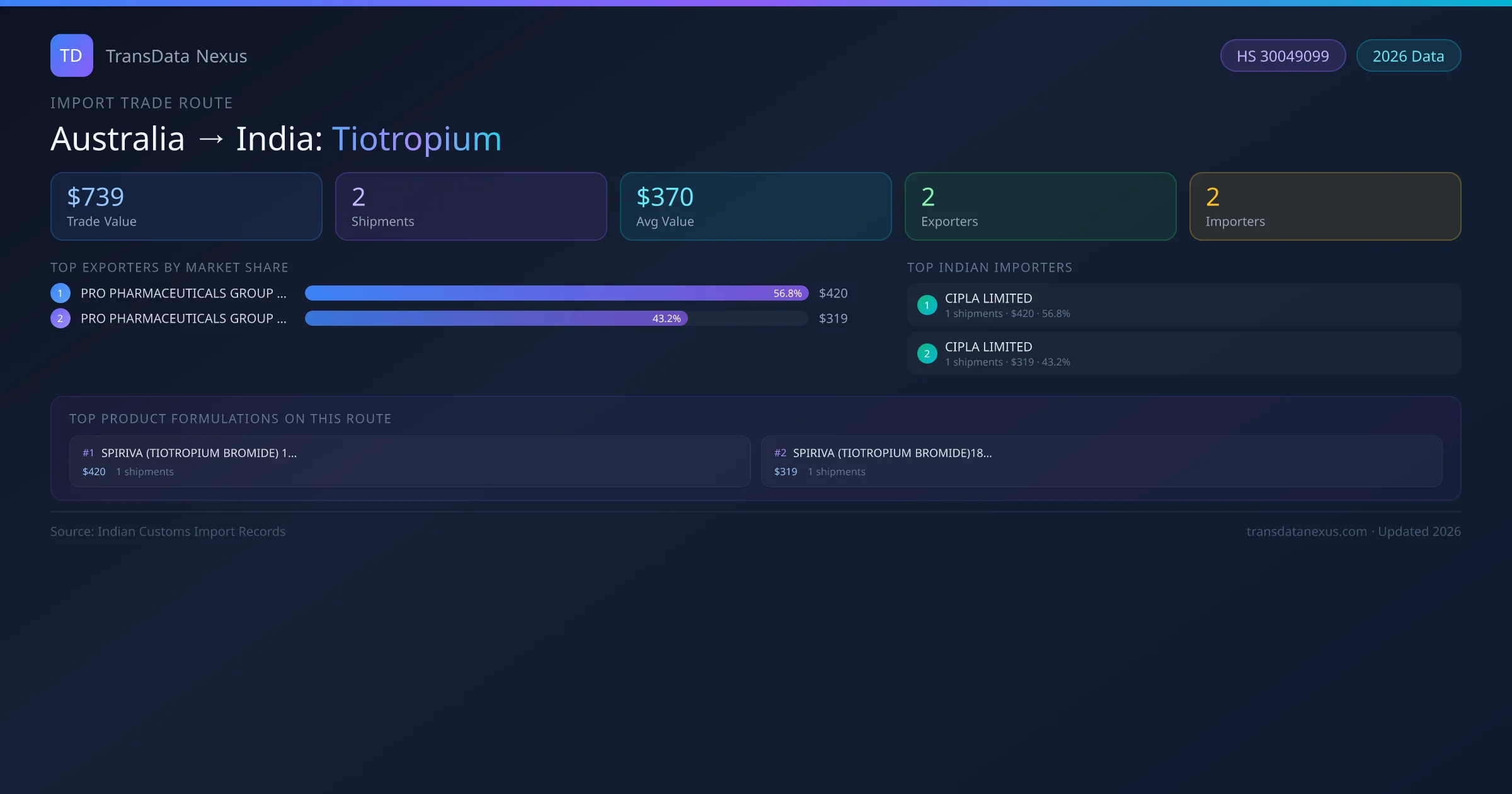 India imports Tiotropium from Australia worth approximately $739 USD across 2 recorded shipments. The average value per shipment is $370 USD.