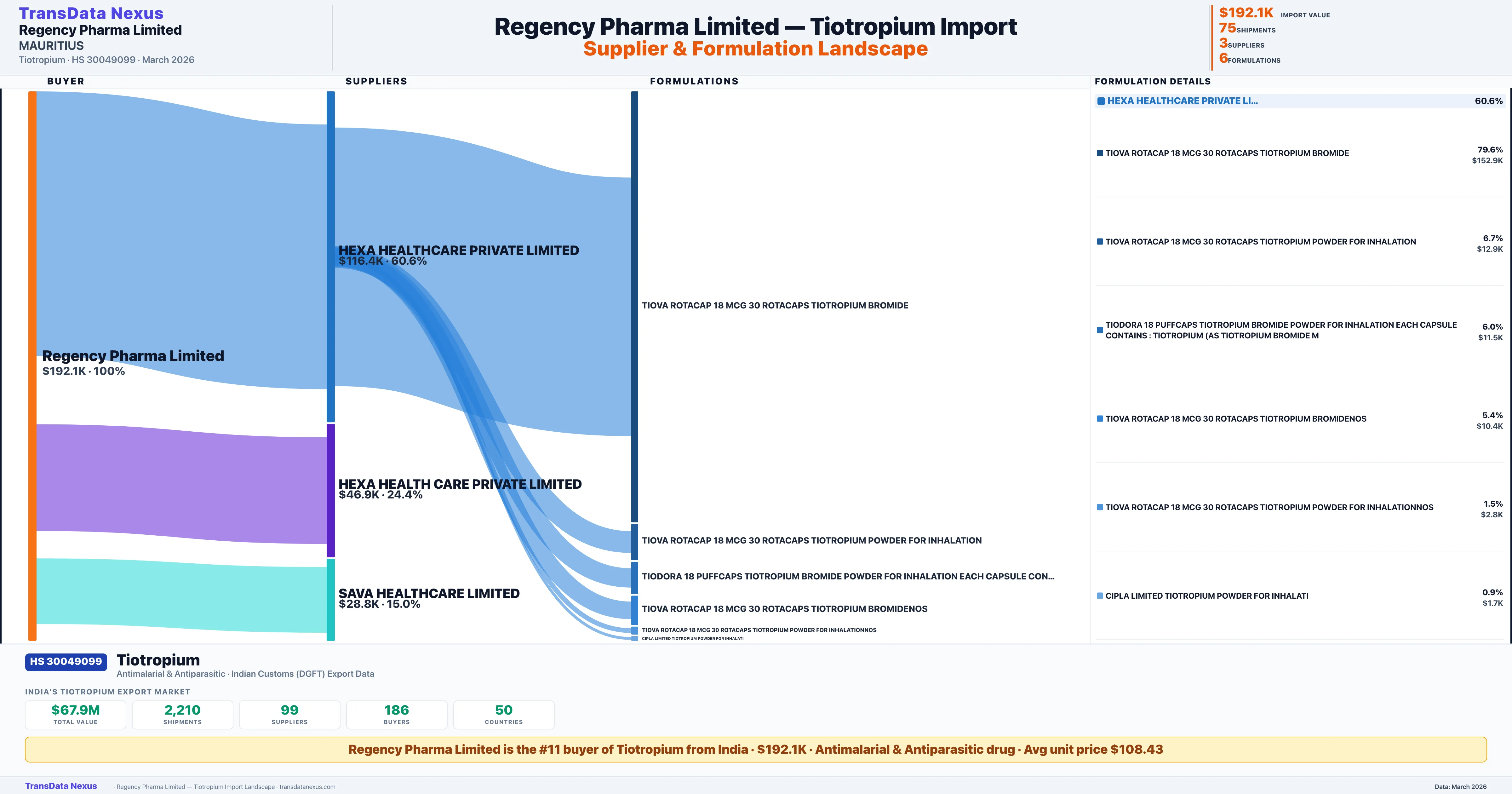 REGENCY PHARMA LIMITED sources Tiotropium from 3 verified Indian suppliers: HEXA HEALTHCARE PRIVATE LIMITED ($116.4K, 60.6%), HEXA HEALTH CARE PRIVATE LIMITED ($46.9K, 24.4%), SAVA HEALTHCARE LIMITED ($28.8K, 15.0%). This is based on 75 customs records.