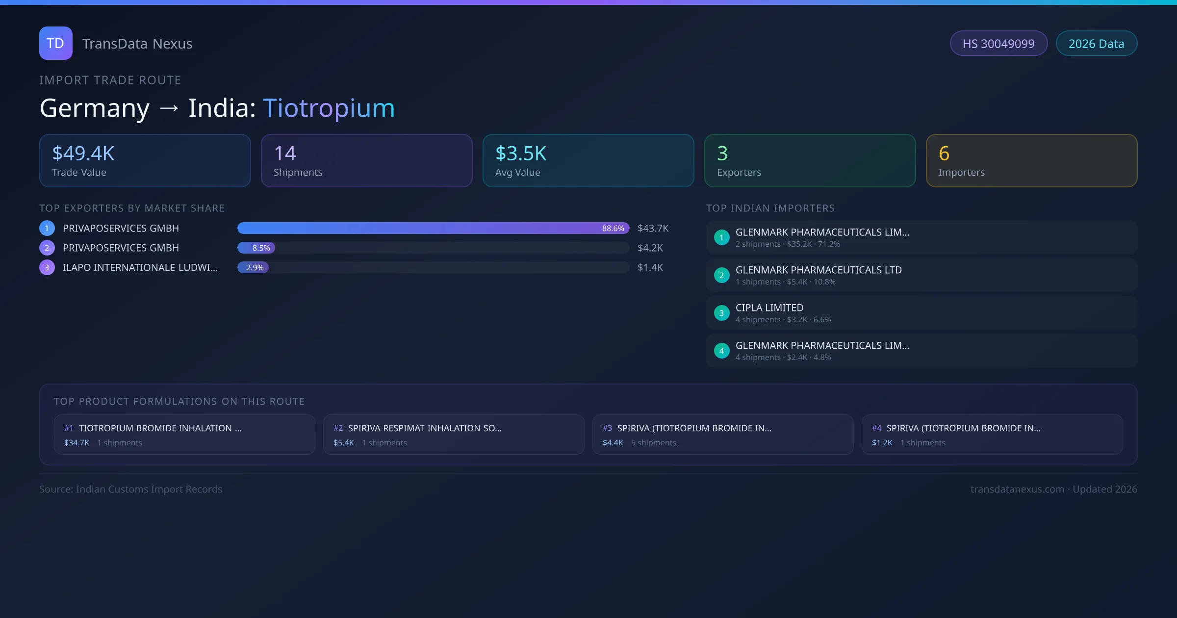 On the buying side, GLENMARK PHARMACEUTICALS LIMITED is the largest importer with 2 shipments worth $35.2K USD — representing 71% of all tiotropium imports from Germany on this route. A total of 6 buyers are active on this corridor.