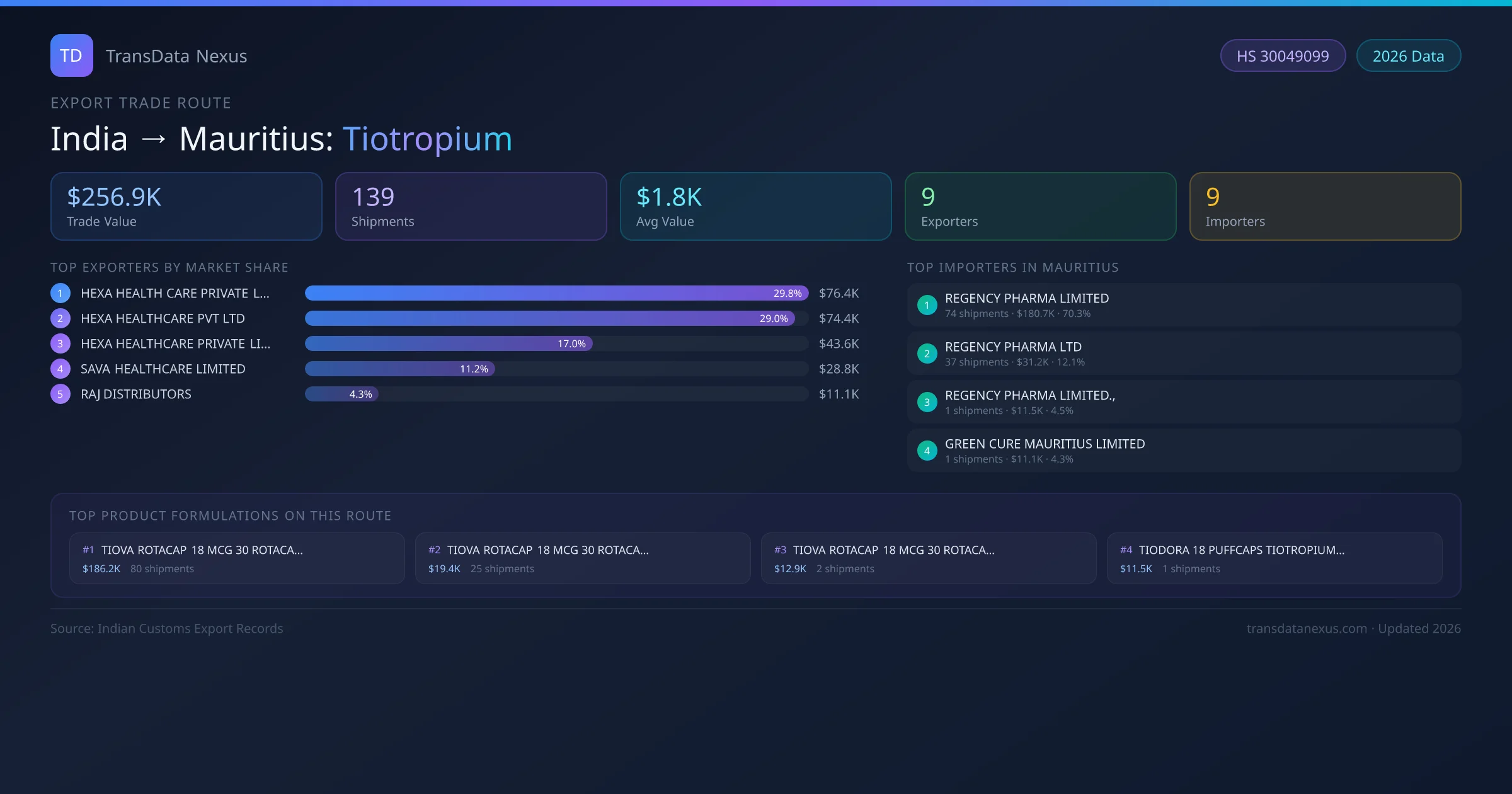 The India to Mauritius Tiotropium corridor is one of India's established pharmaceutical export routes, with 139 shipments documented worth a combined $256.9K USD. The route is dominated by HEXA HEALTH CARE PRIVATE LIMITED, which alone accounts for roughly 30% of all export value, reflecting the consolidated nature of India's tiotropium manufacturing sector.
