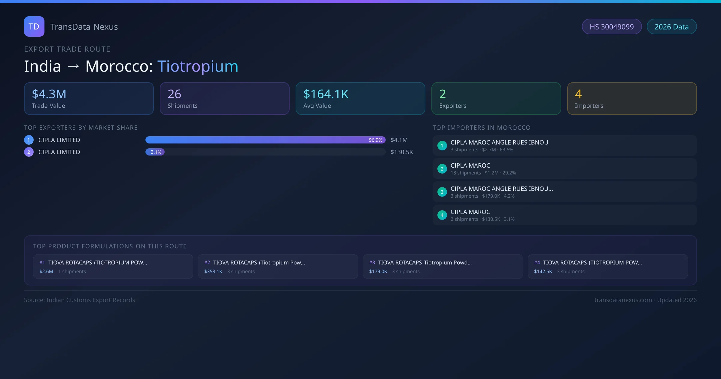 India exports Tiotropium to Morocco worth approximately $4.3M USD across 26 recorded shipments. The average value per shipment is $164.1K USD.