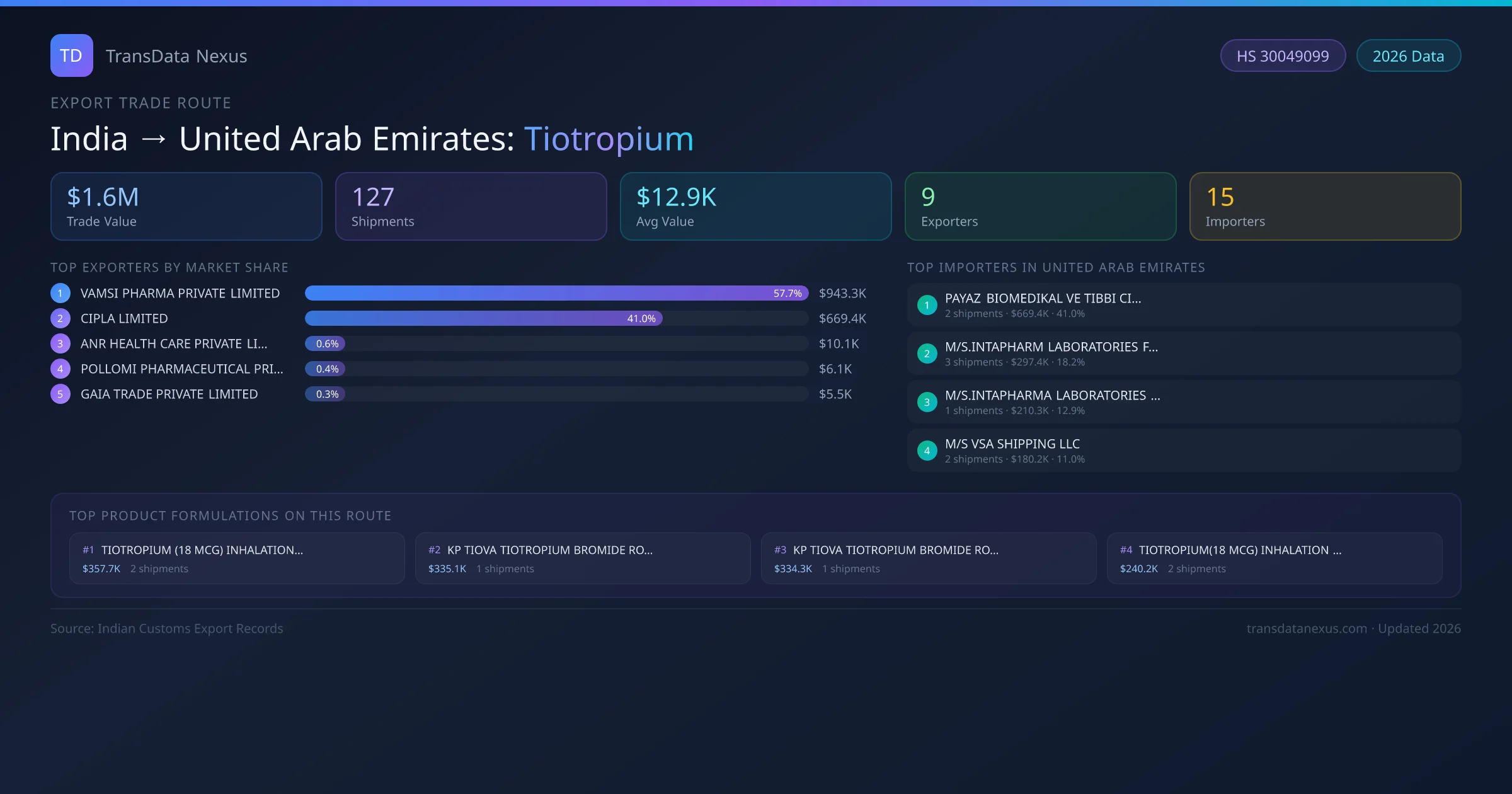 The leading Indian exporters of Tiotropium to United Arab Emirates are VAMSI PHARMA PRIVATE LIMITED, CIPLA LIMITED, ANR HEALTH CARE PRIVATE LIMITED. VAMSI PHARMA PRIVATE LIMITED holds the largest market share at approximately 58% of total trade value on this route.