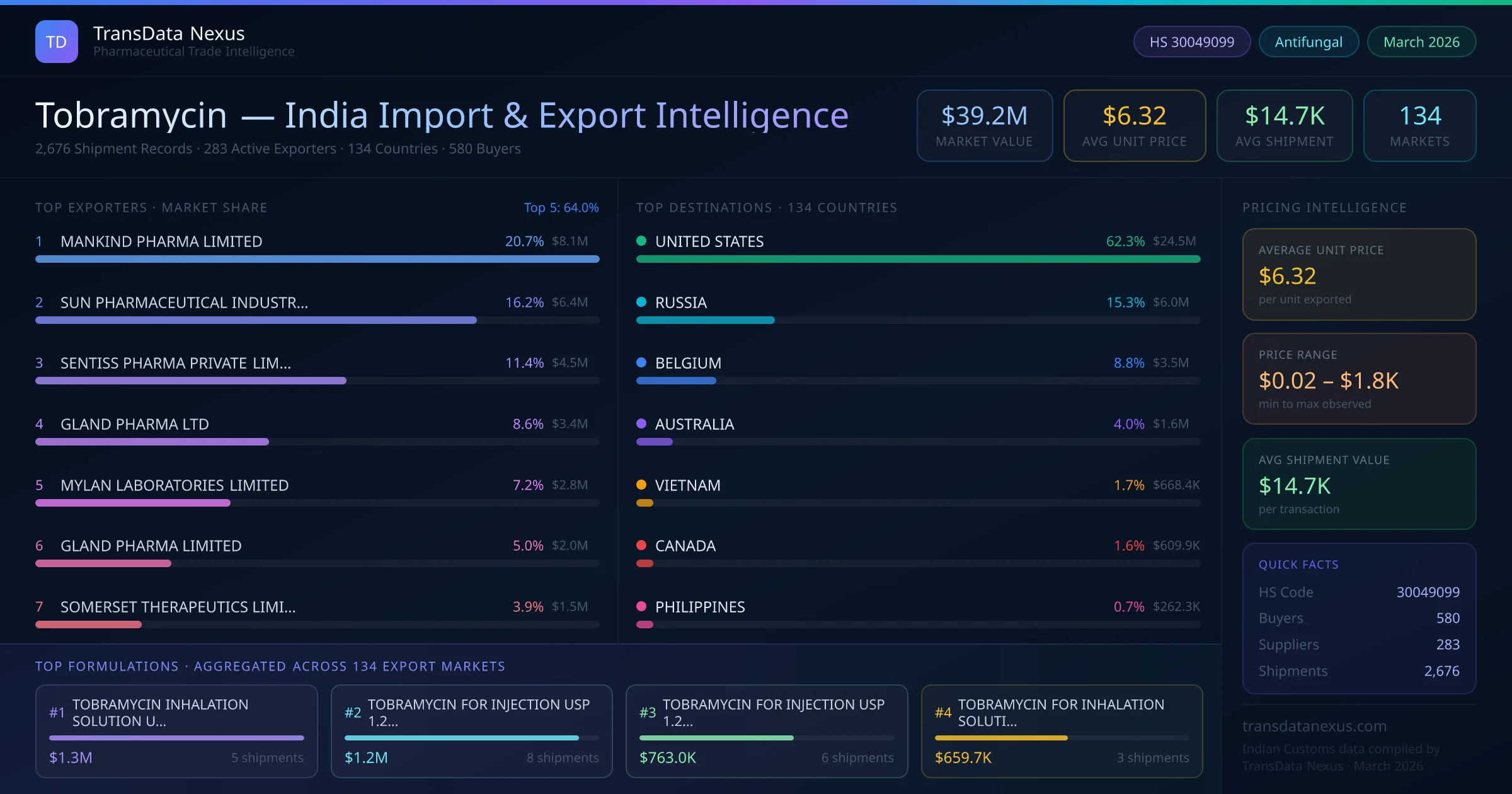 Between 2022 and 2026, India exported $39.2M worth of tobramycin across 2,676 verified shipments to 134 countries — covering 69% of world markets in the Antibiotics segment. The largest destination is UNITED STATES (62.3%). MANKIND PHARMA LIMITED leads with a 20.7% share. All figures are drawn from Indian Customs (DGFT) shipping bill records spanning four years of trade activity.