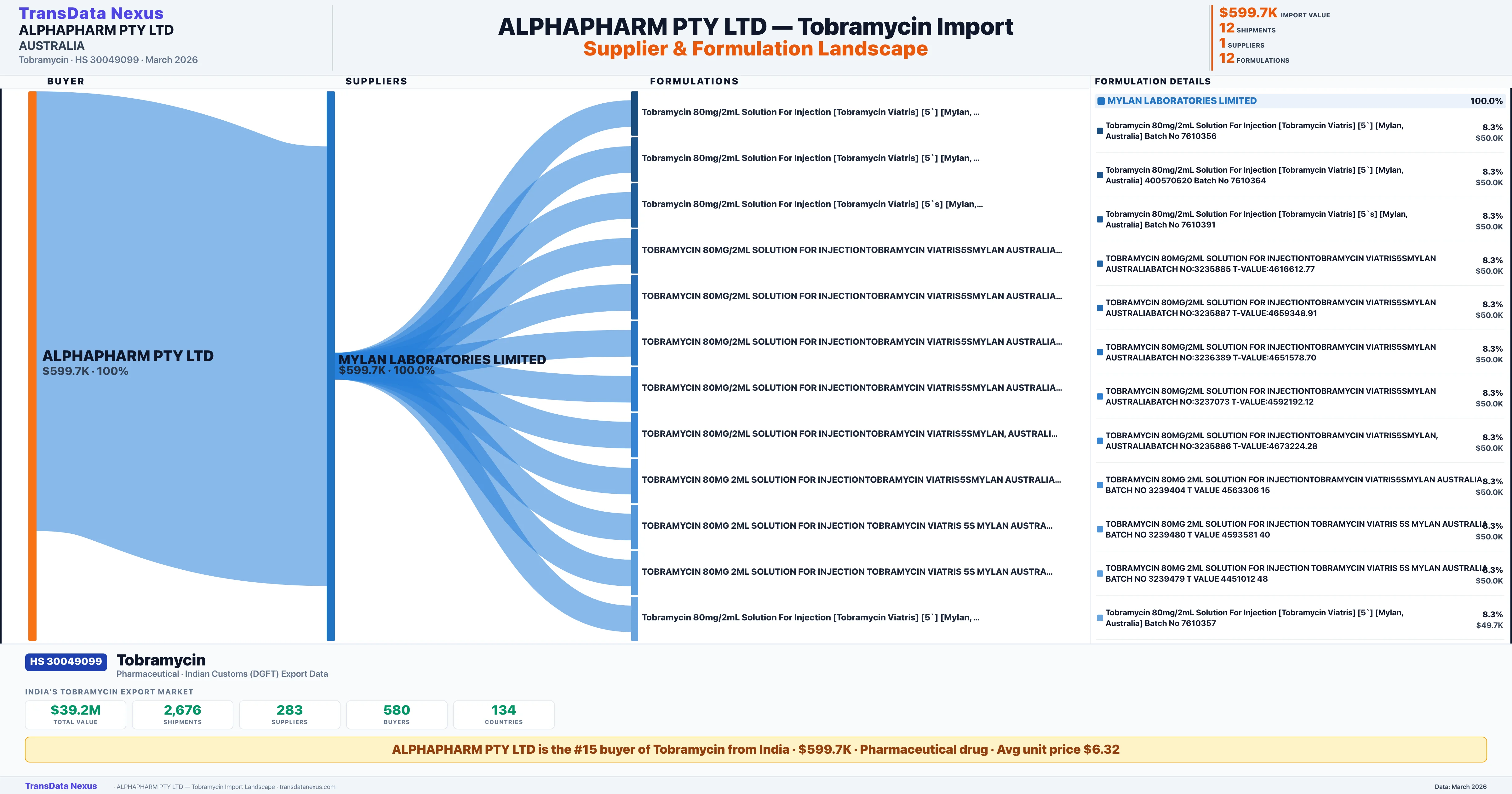 ALPHAPHARM PTY LTD sources Tobramycin from 1 verified Indian supplier: MYLAN LABORATORIES LIMITED ($599.7K, 100.0%). This is based on 12 customs records.
