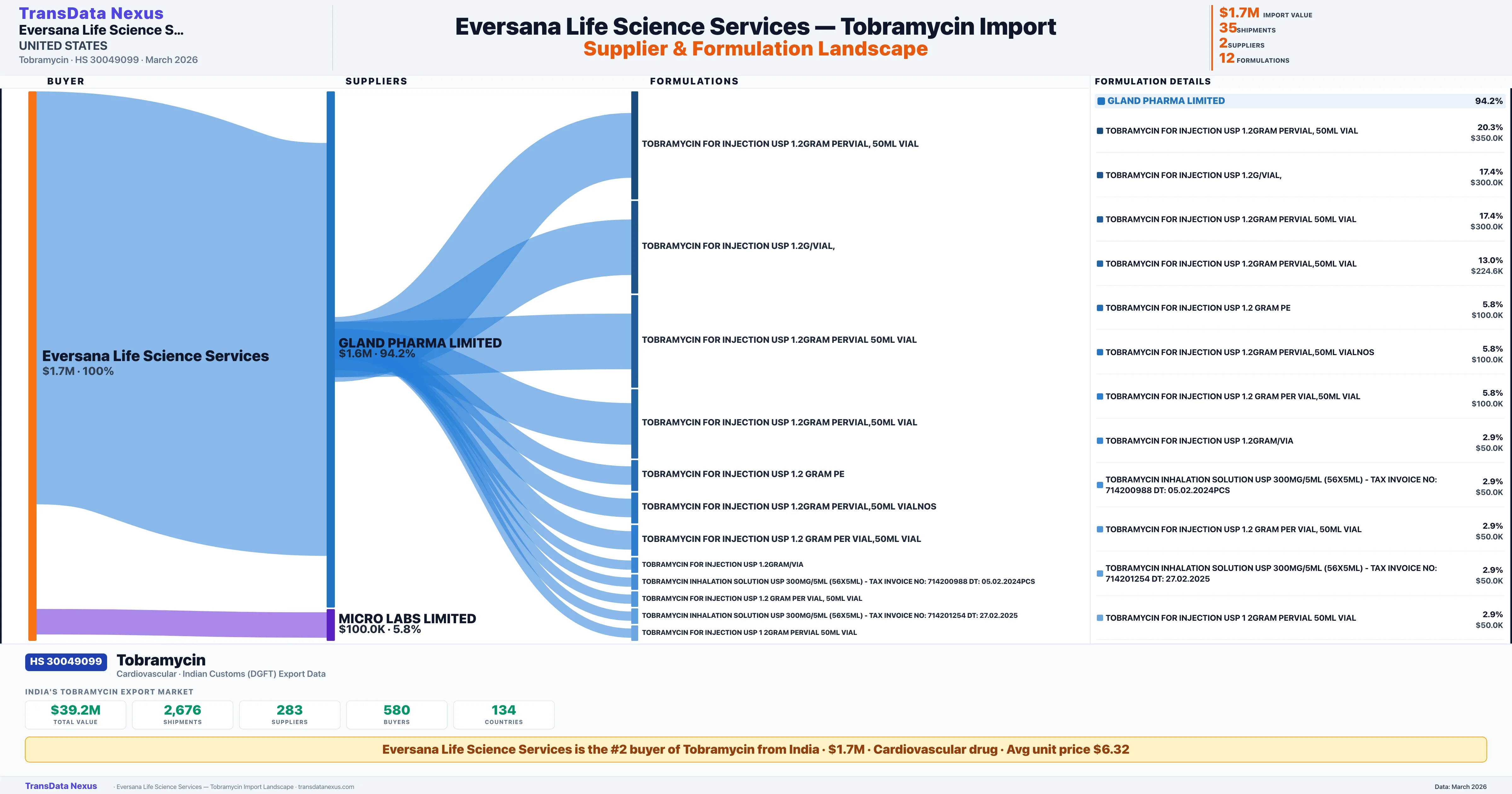 EVERSANA LIFE SCIENCE SERVICES sources Tobramycin from 2 verified Indian suppliers: GLAND PHARMA LIMITED ($1.6M, 94.2%), MICRO LABS LIMITED ($100.0K, 5.8%). This is based on 35 customs records.