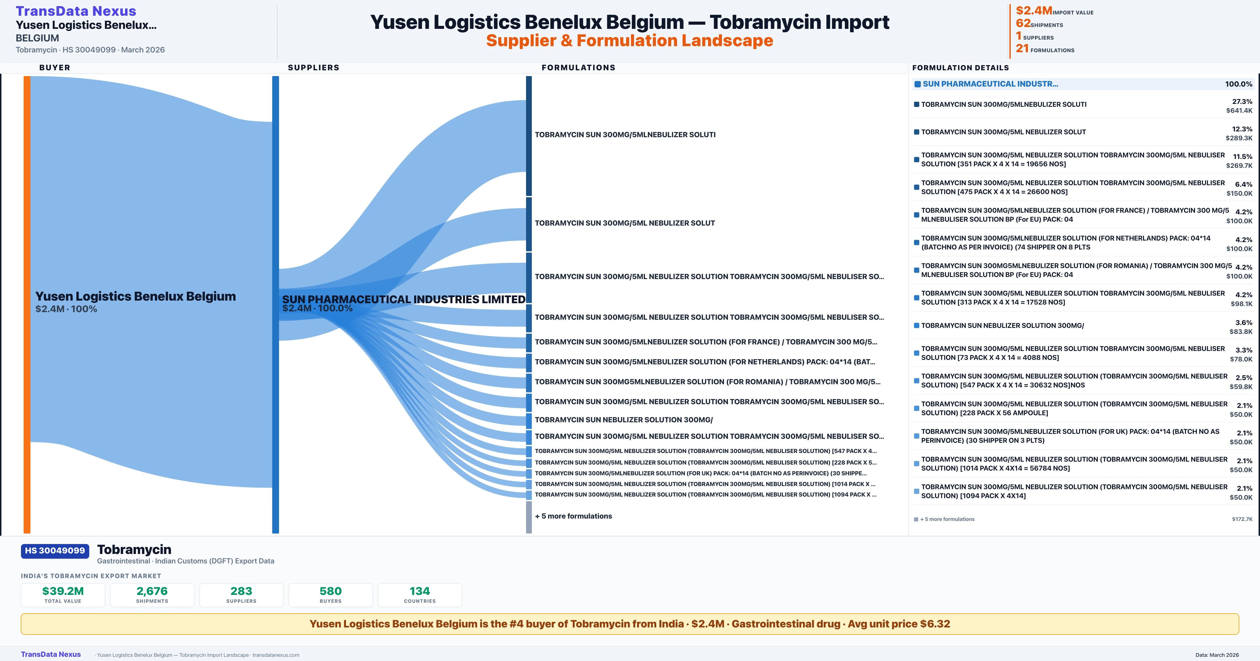 Access order-level details, pricing data, supplier connections, and competitive analysis for YUSEN LOGISTICS BENELUX BELGIUM's Tobramycin imports. TransData Nexus provides verified Indian Customs (DGFT) data trusted by pharmaceutical trade professionals worldwide.