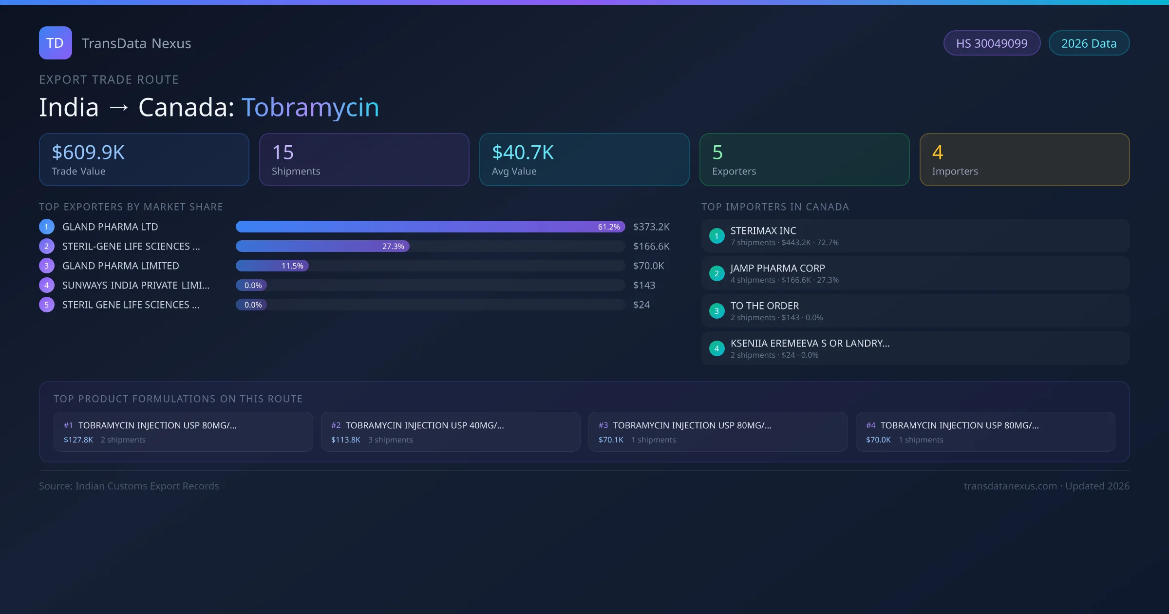 - 1.Route Identification: India to Canada export trade corridor identified from Indian Customs (DGFT) records for Tobramycin.