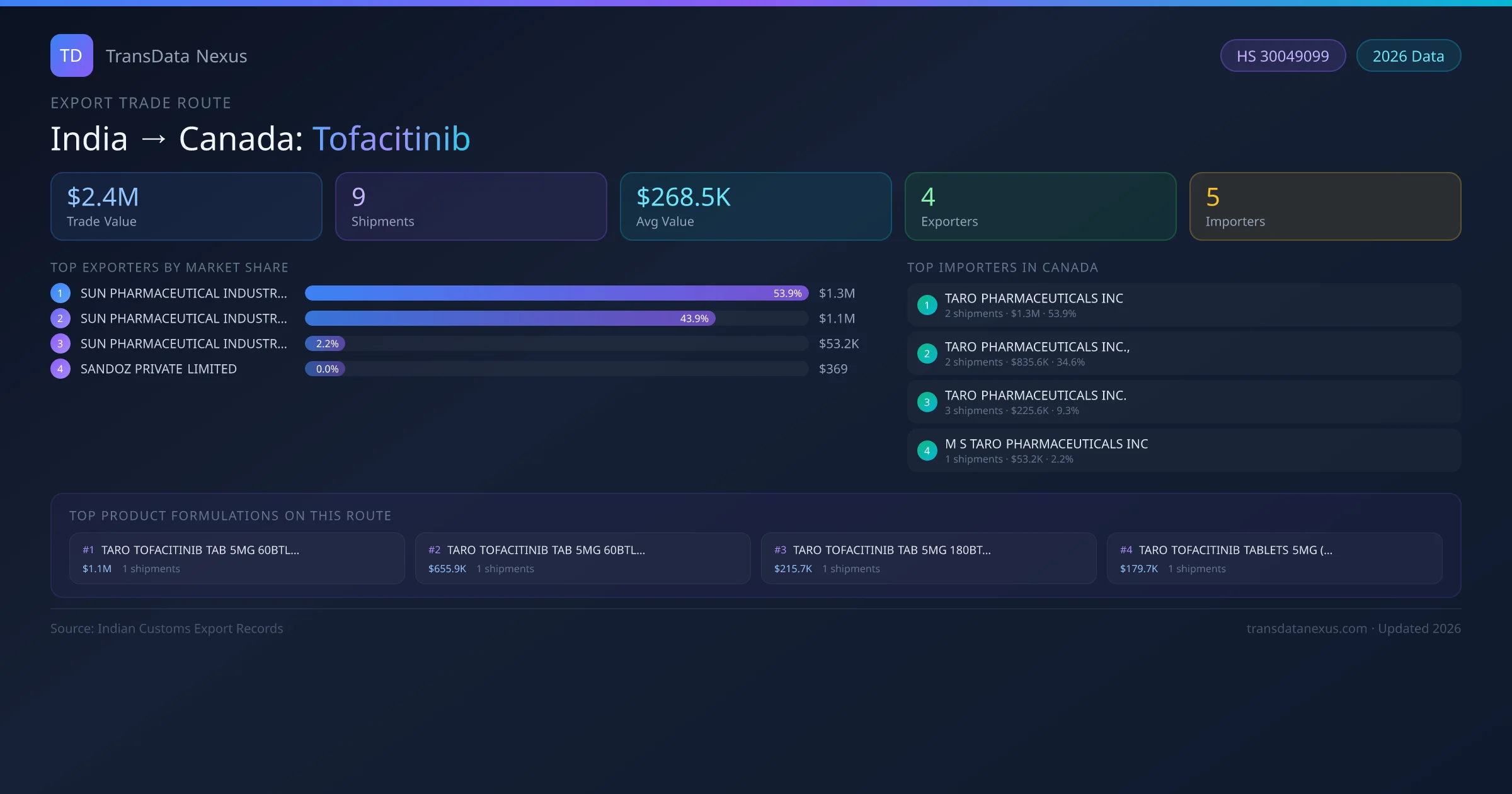 On the import side, key buyers of Indian tofacitinib in Canada include TARO PHARMACEUTICALS INC , TARO PHARMACEUTICALS INC.,, TARO PHARMACEUTICALS INC. and 2 others. TARO PHARMACEUTICALS INC is the single largest importer with 2 shipments valued at $1.3M USD.