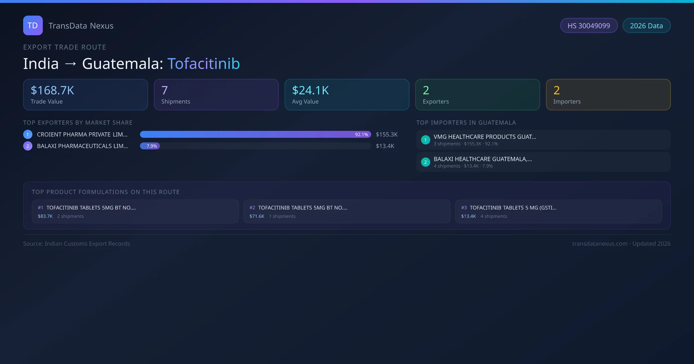 India exports Tofacitinib to Guatemala worth approximately $168.7K USD across 7 recorded shipments. The average value per shipment is $24.1K USD.