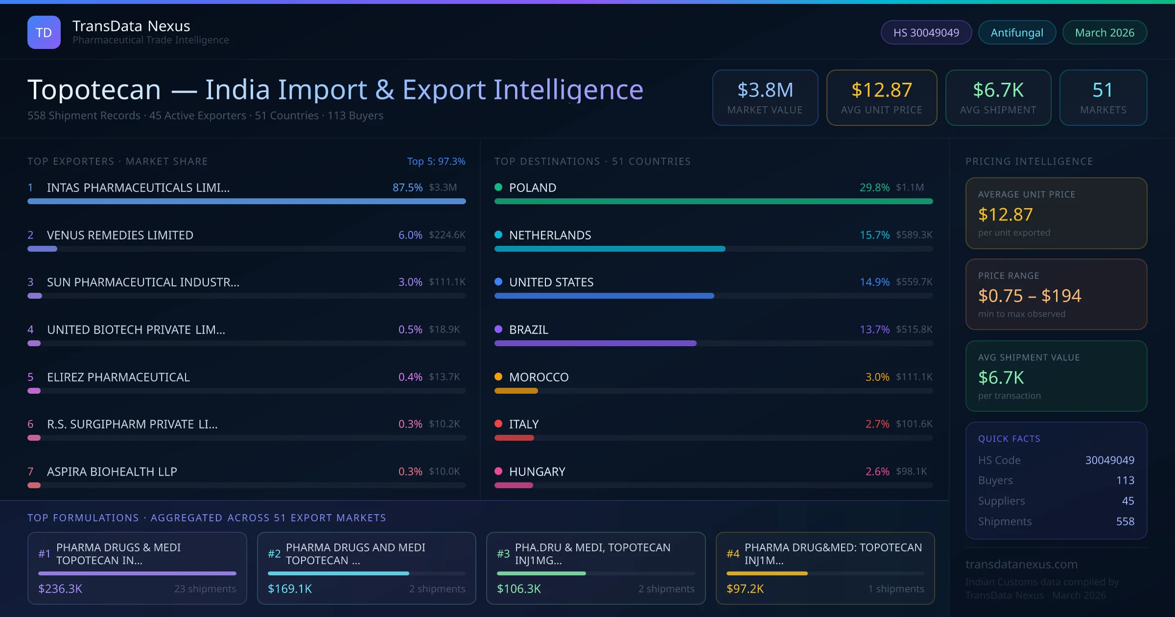 Between 2022 and 2026, India exported $3.8M worth of topotecan across 558 verified shipments to 51 countries — covering 26% of world markets in the Advanced Oncology segment. The largest destination is POLAND (29.8%). INTAS PHARMACEUTICALS LIMITED leads with a 87.5% share. All figures are drawn from Indian Customs (DGFT) shipping bill records spanning four years of trade activity.