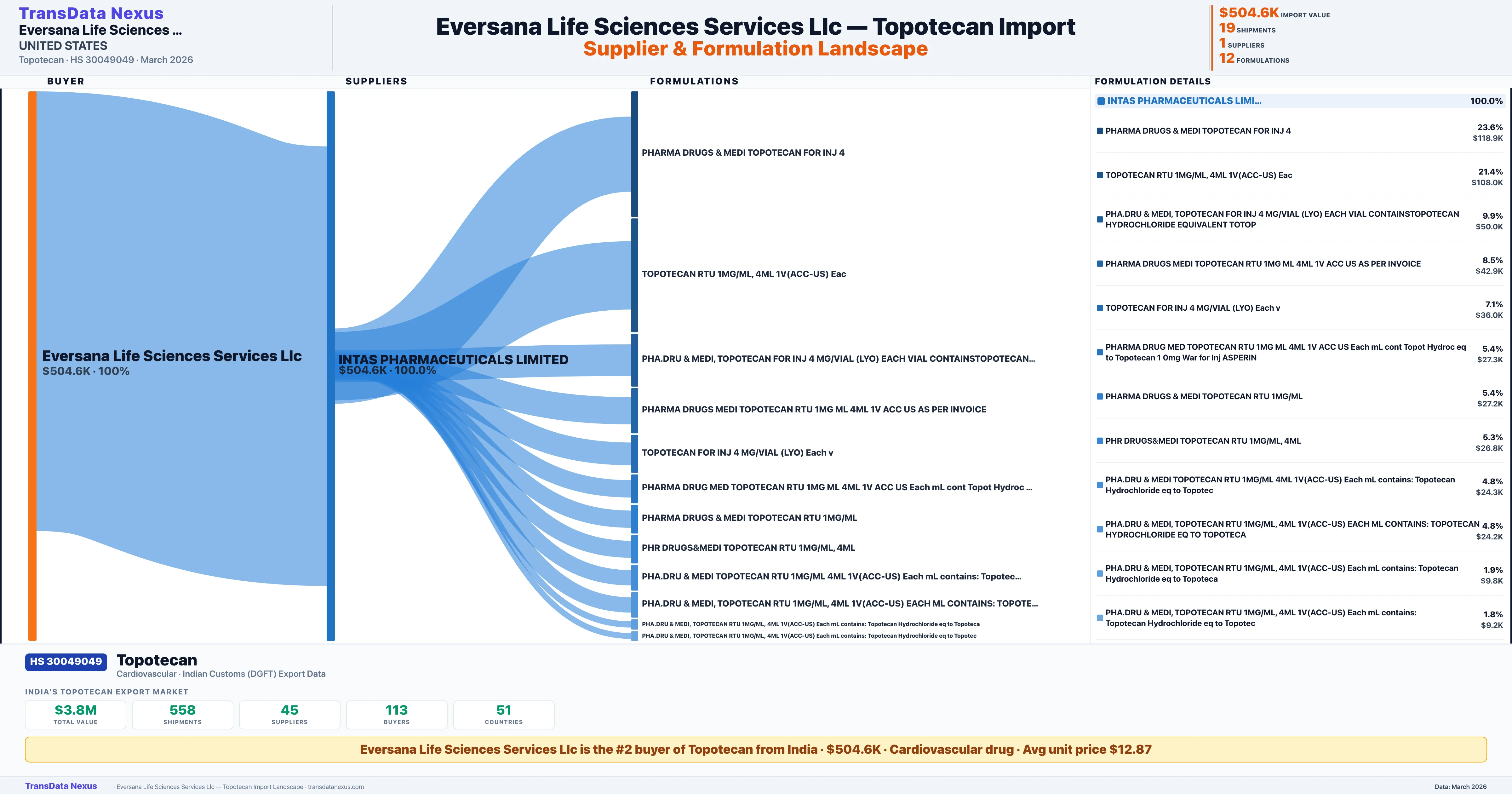 EVERSANA LIFE SCIENCES SERVICES,LLC sources Topotecan from 1 verified Indian supplier: INTAS PHARMACEUTICALS LIMITED ($504.6K, 100.0%). This is based on 19 customs records.