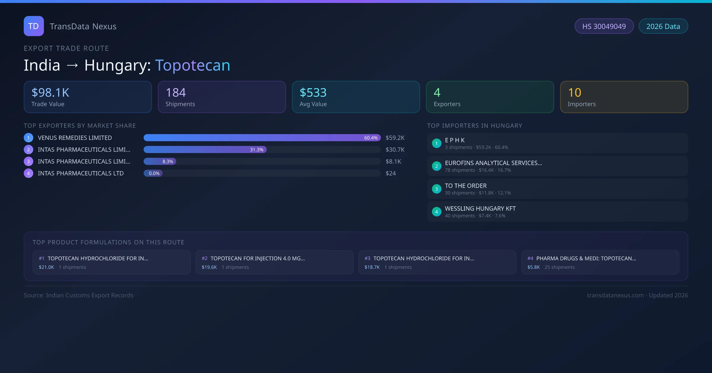 India has recorded 184 verified shipments of Topotecan exported to Hungary, representing a combined trade value of $98.1K USD. This corridor is served by 4 active Indian exporters, with an average shipment value of $533 USD. The leading Indian exporter is VENUS REMEDIES LIMITED, which accounts for 60% of total export value with 3 shipments worth $59.2K USD. On the buying side, E P H K is the largest importer in Hungary with $59.2K USD in purchases. The top 3 suppliers — VENUS REMEDIES LIMITED, INTAS PHARMACEUTICALS LIMITED, INTAS PHARMACEUTICALS LIMITED — together control 100% of total trade value on this route. All data sourced from Indian Customs (DGFT) shipping bill records. Values reported in FOB USD.