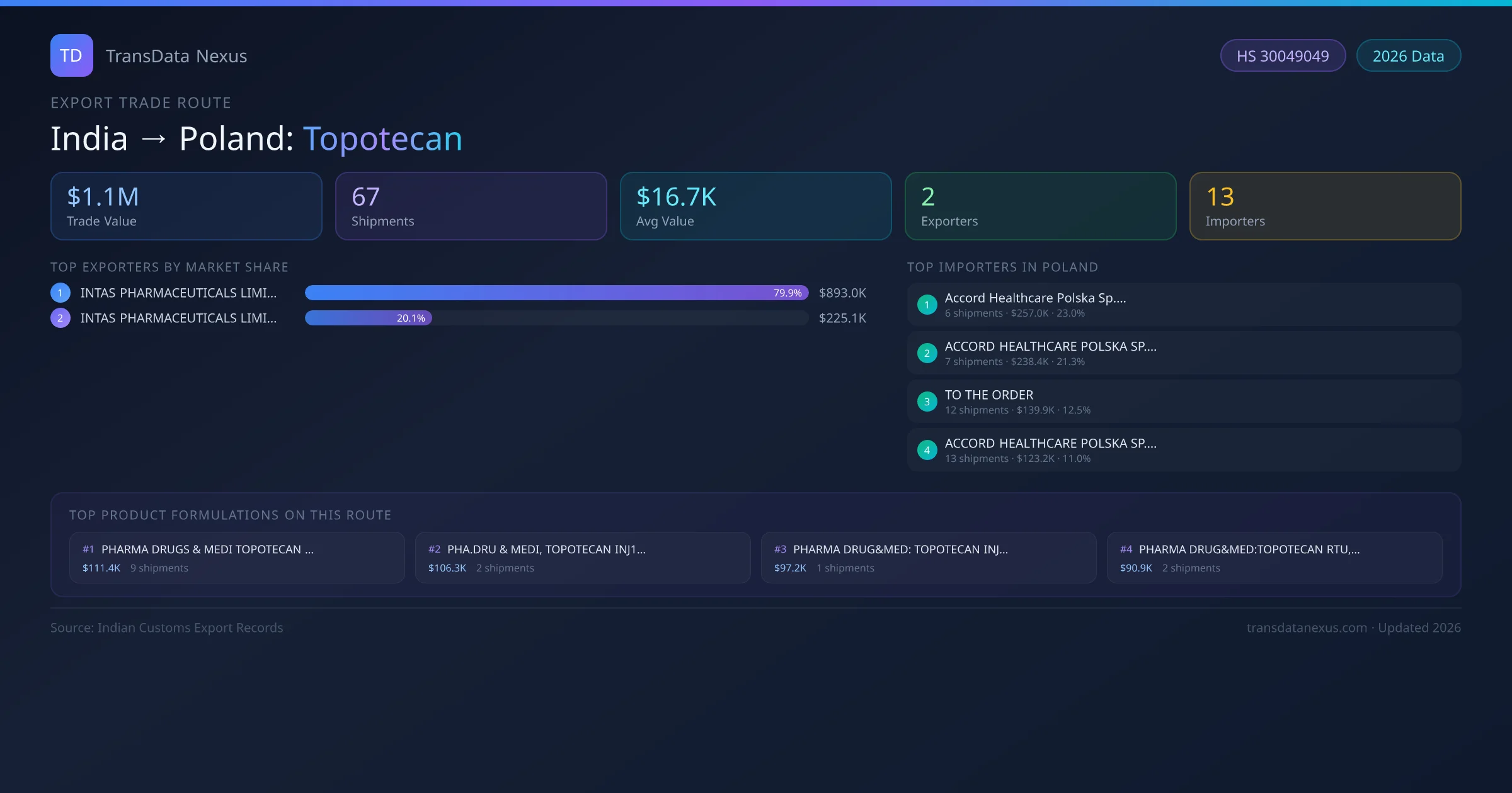 - 1.Route Identification: India to Poland export trade corridor identified from Indian Customs (DGFT) records for Topotecan.