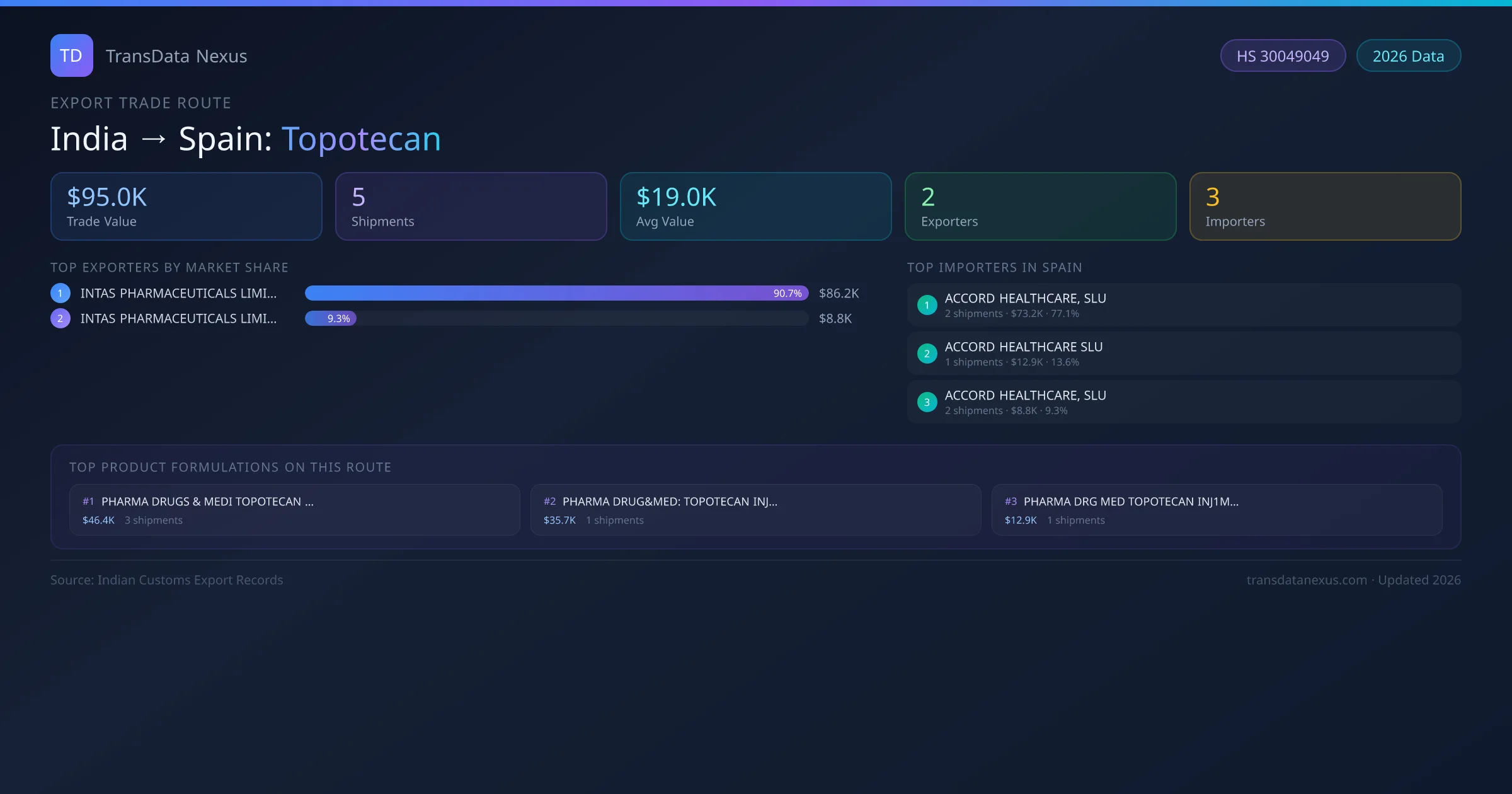 India has recorded 5 verified shipments of Topotecan exported to Spain, representing a combined trade value of $95.0K USD. This corridor is served by 2 active Indian exporters, with an average shipment value of $19.0K USD. The leading Indian exporter is INTAS PHARMACEUTICALS LIMITED, which accounts for 91% of total export value with 3 shipments worth $86.2K USD. On the buying side, ACCORD HEALTHCARE, SLU is the largest importer in Spain with $73.2K USD in purchases. All data sourced from Indian Customs (DGFT) shipping bill records. Values reported in FOB USD.