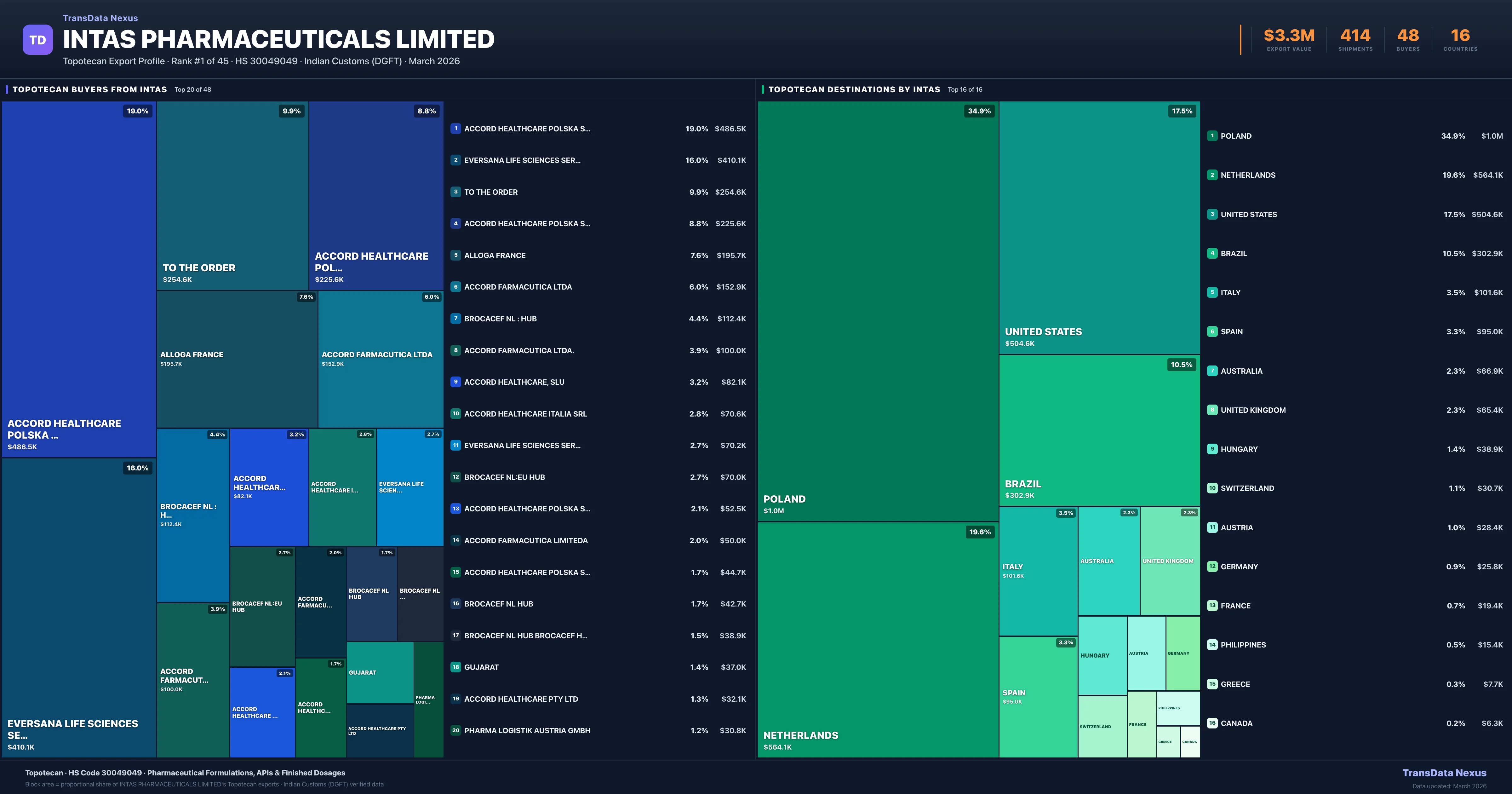 Intas Pharmaceuticals Limited's average Topotecan shipment value is $7.9K per consignment, based on 414 shipments totaling $3.3M. The largest destination is POLAND (34.9% of Intas Pharmaceuticals Limited's Topotecan exports).