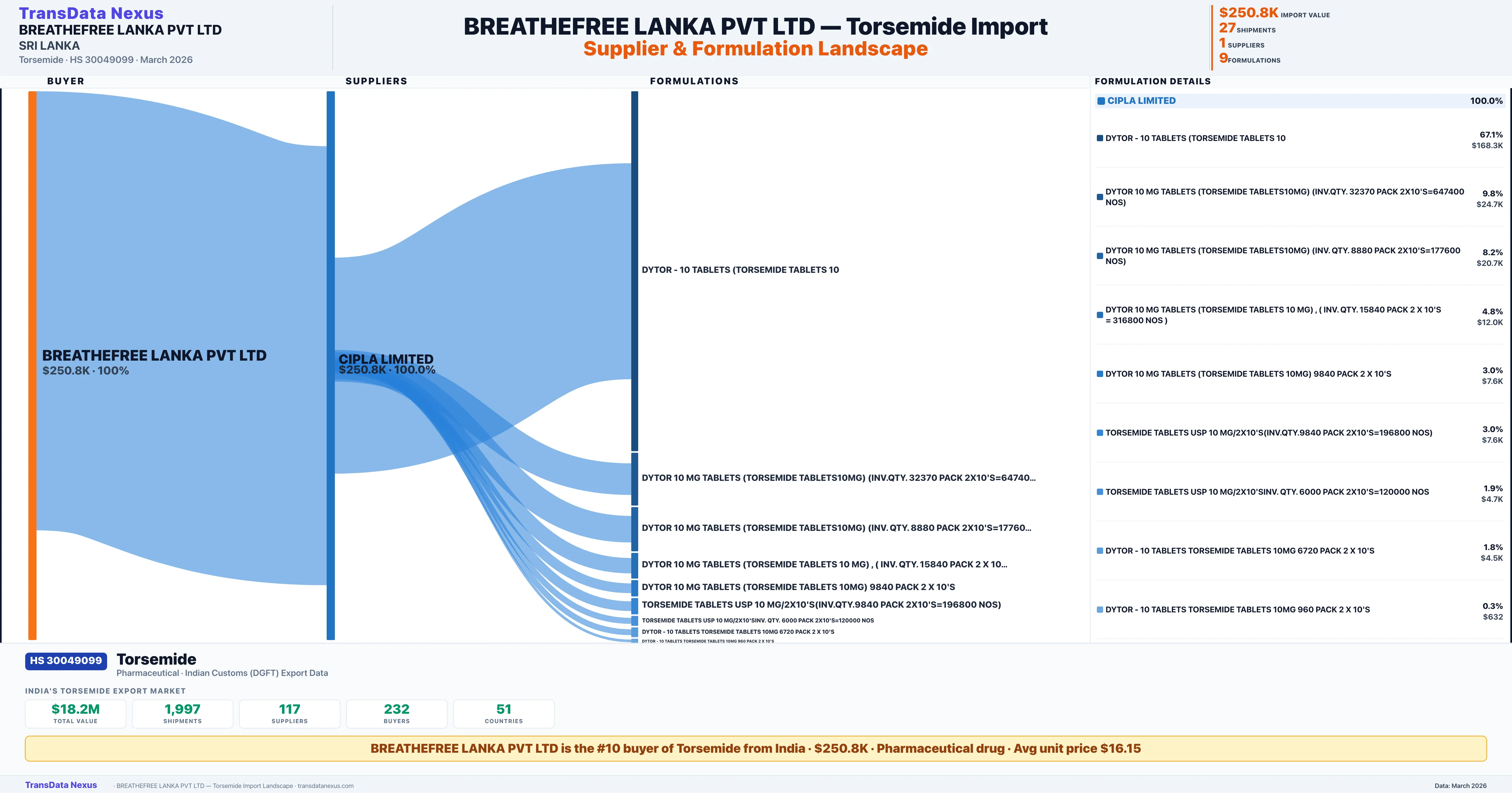 BREATHEFREE LANKA PVT LTD β Torsemide Import Profile: Suppliers, Formulations & Sources