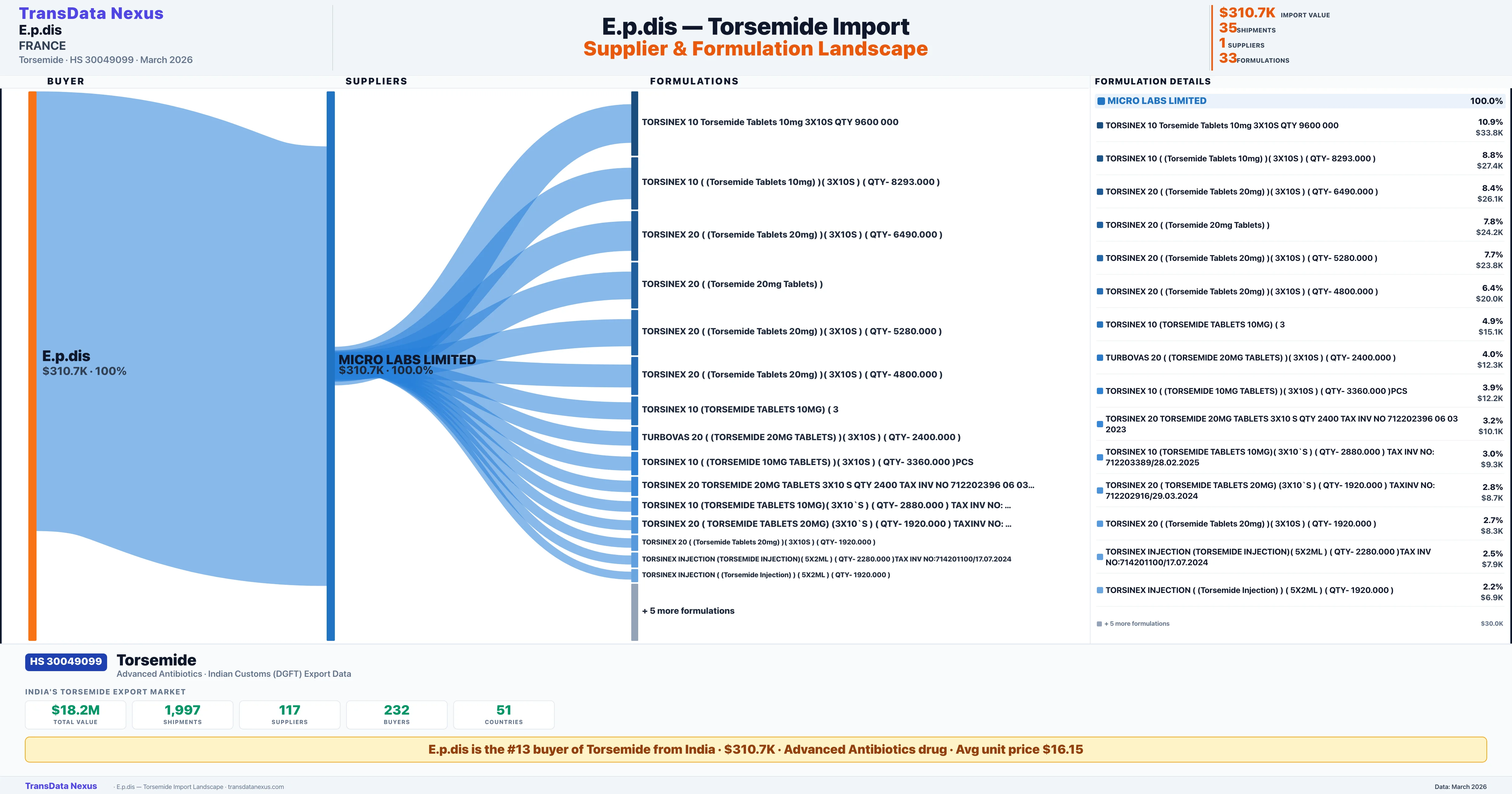 E.P.DIS sources Torsemide from 1 verified Indian supplier: MICRO LABS LIMITED ($310.7K, 100.0%). This is based on 35 customs records.