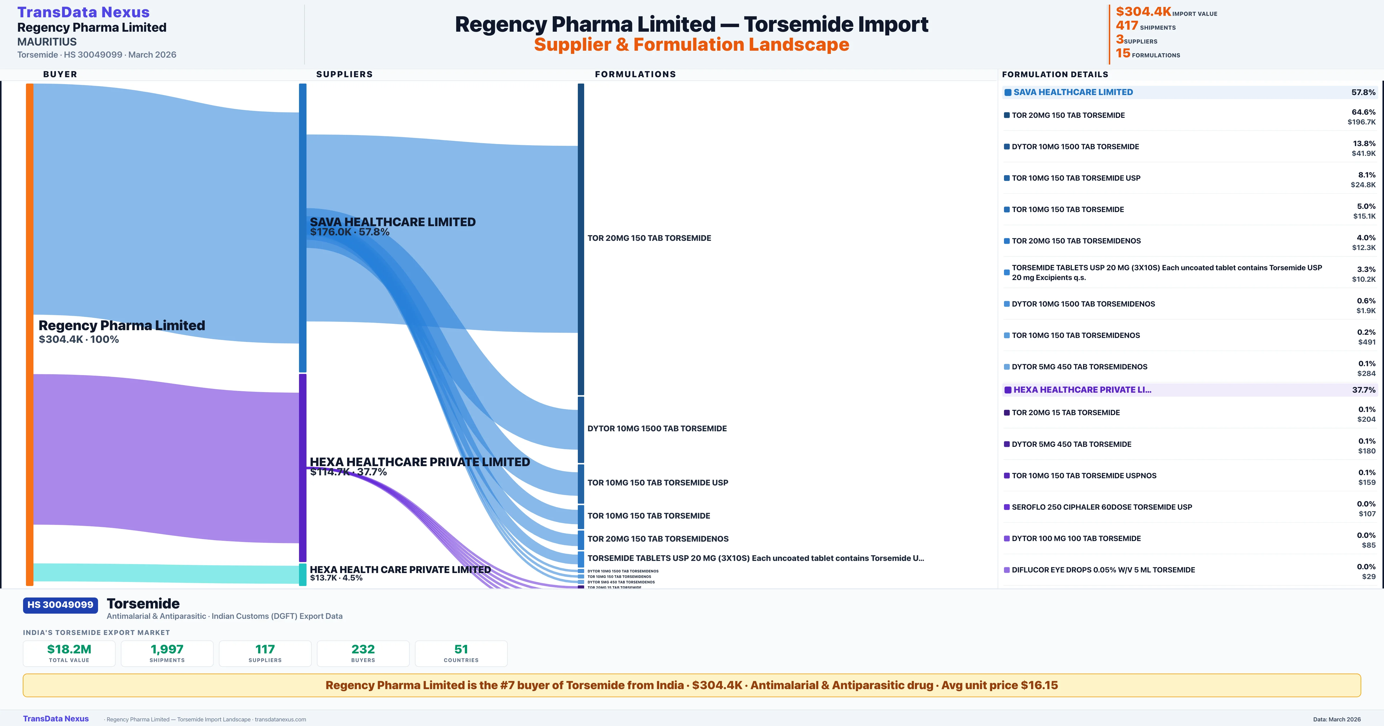 REGENCY PHARMA LIMITED sources Torsemide from 3 verified Indian suppliers: SAVA HEALTHCARE LIMITED ($176.0K, 57.8%), HEXA HEALTHCARE PRIVATE LIMITED ($114.7K, 37.7%), HEXA HEALTH CARE PRIVATE LIMITED ($13.7K, 4.5%). This is based on 417 customs records.