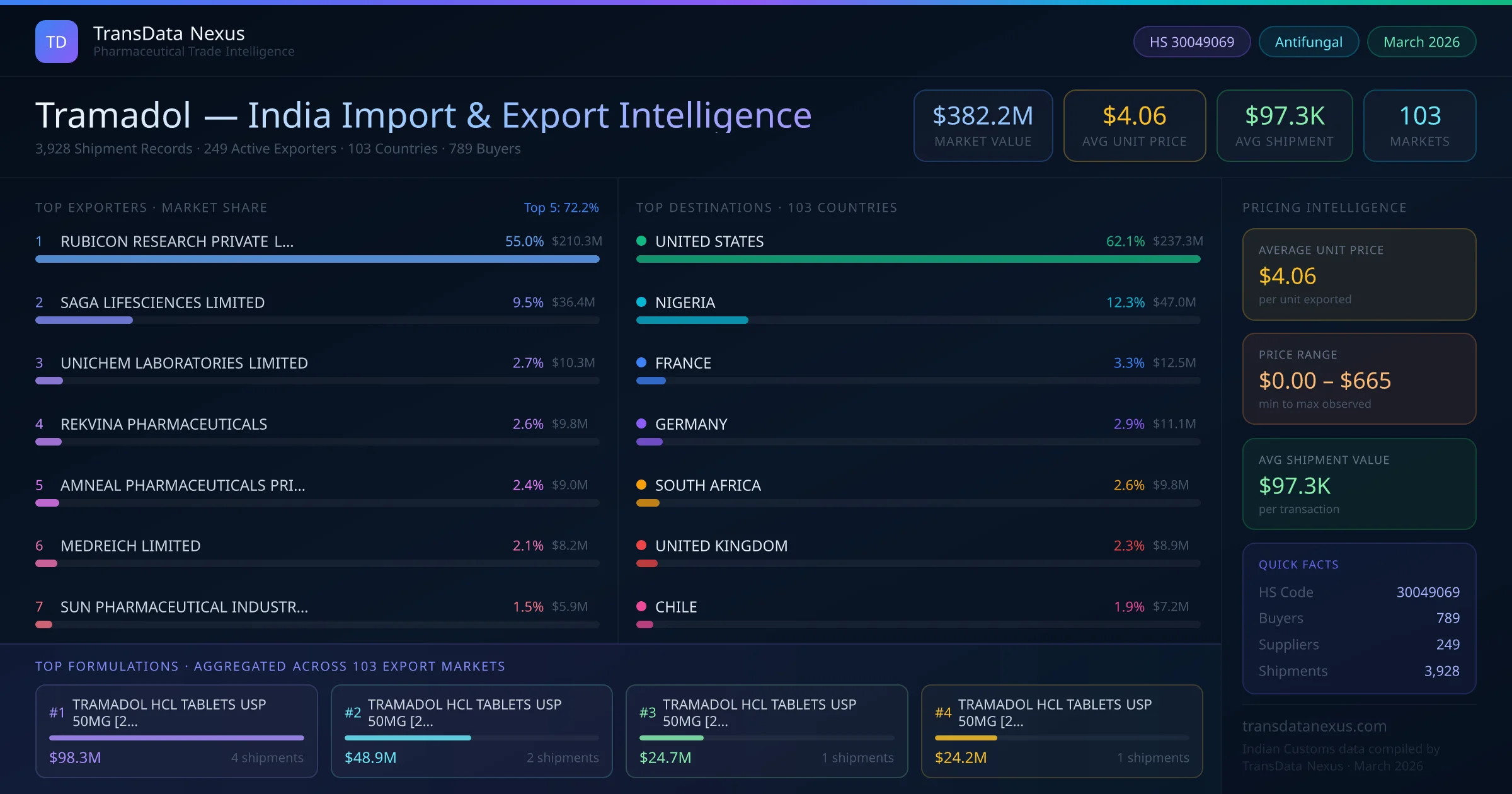 Between 2022 and 2026, India exported $382.2M worth of tramadol across 3,928 verified shipments to 103 countries — covering 53% of world markets in the Analgesics & Antipyretics segment. The largest destination is UNITED STATES (62.1%). RUBICON RESEARCH PRIVATE LIMITED leads with a 55.0% share. All figures are drawn from Indian Customs (DGFT) shipping bill records spanning four years of trade activity.