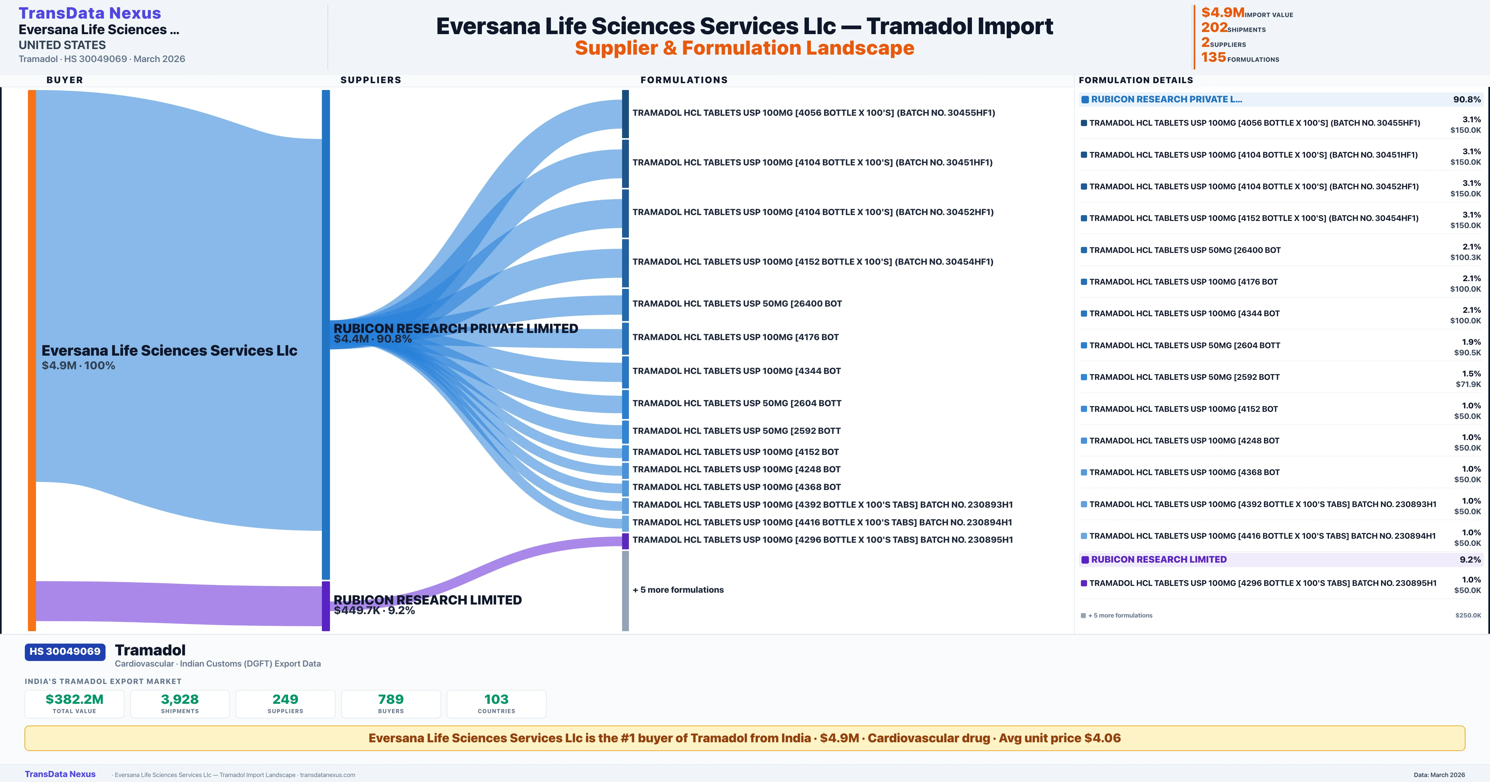 EVERSANA LIFE SCIENCES SERVICES LLC sources Tramadol from 2 verified Indian suppliers: RUBICON RESEARCH PRIVATE LIMITED ($4.4M, 90.8%), RUBICON RESEARCH LIMITED ($449.7K, 9.2%). This is based on 202 customs records.
