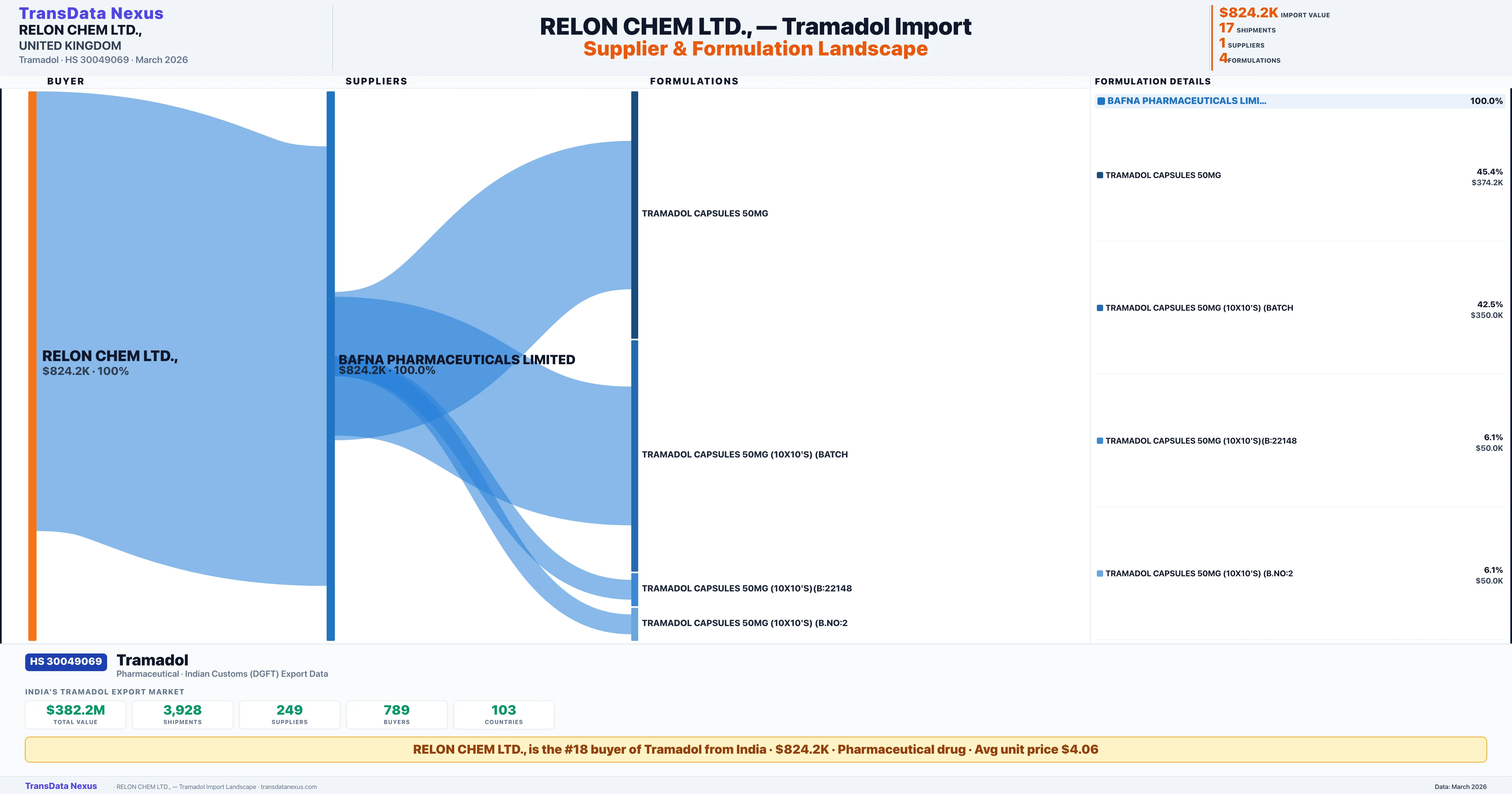 RELON CHEM LTD., sources Tramadol from 1 verified Indian supplier: BAFNA PHARMACEUTICALS LIMITED ($824.2K, 100.0%). This is based on 17 customs records.