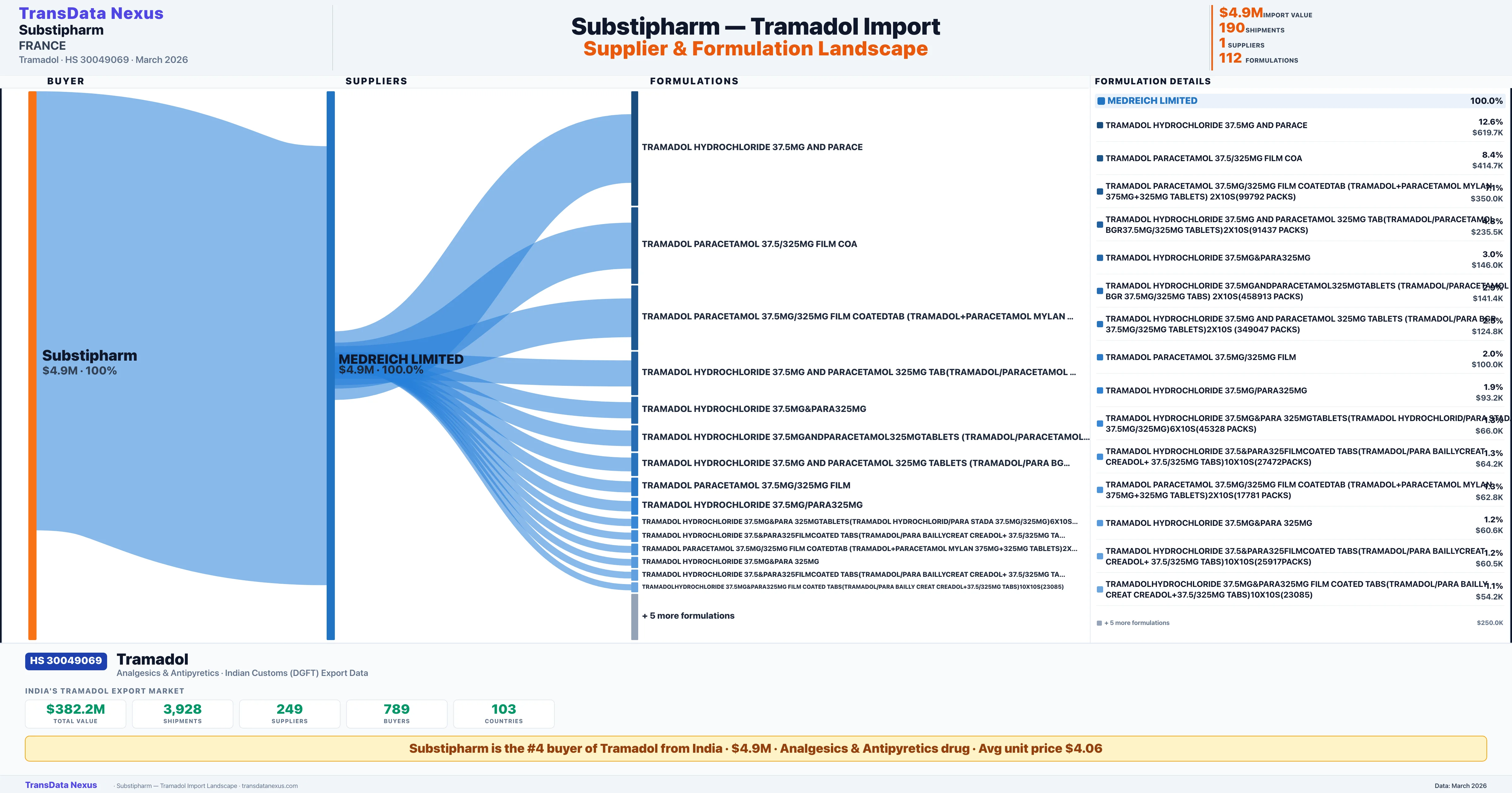 SUBSTIPHARM sources Tramadol from 1 verified Indian supplier: MEDREICH LIMITED ($4.9M, 100.0%). This is based on 190 customs records.