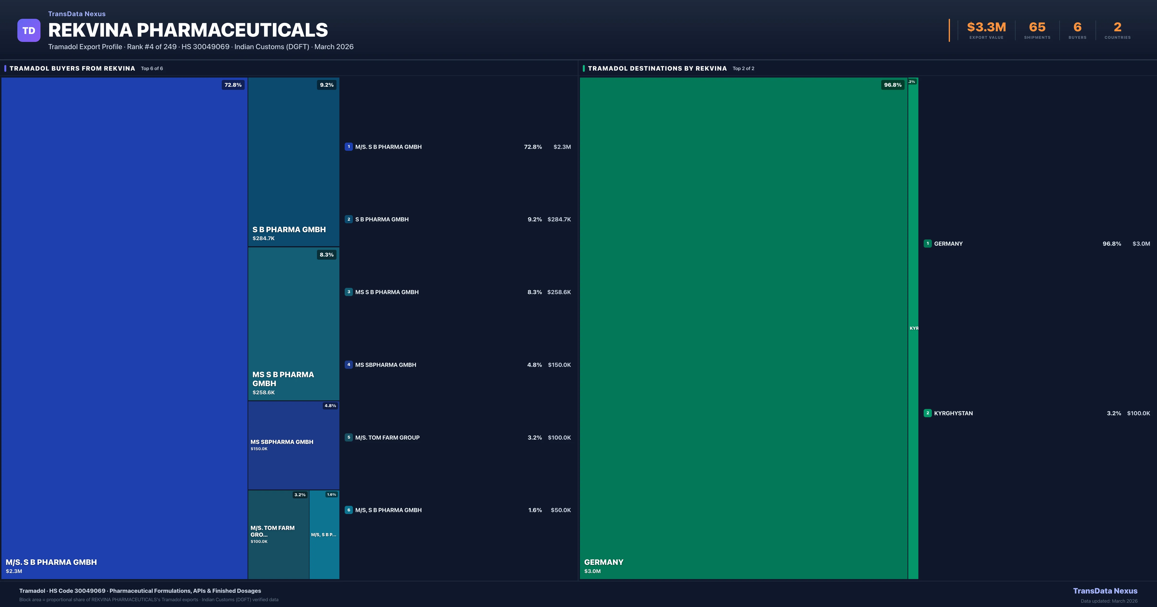 - 4.Verified Records: This page is backed by 65 individual customs records matching Rekvina Pharmaceuticals exporting Tramadol, covering 28 formulations to 2 countries via 6 buyers.