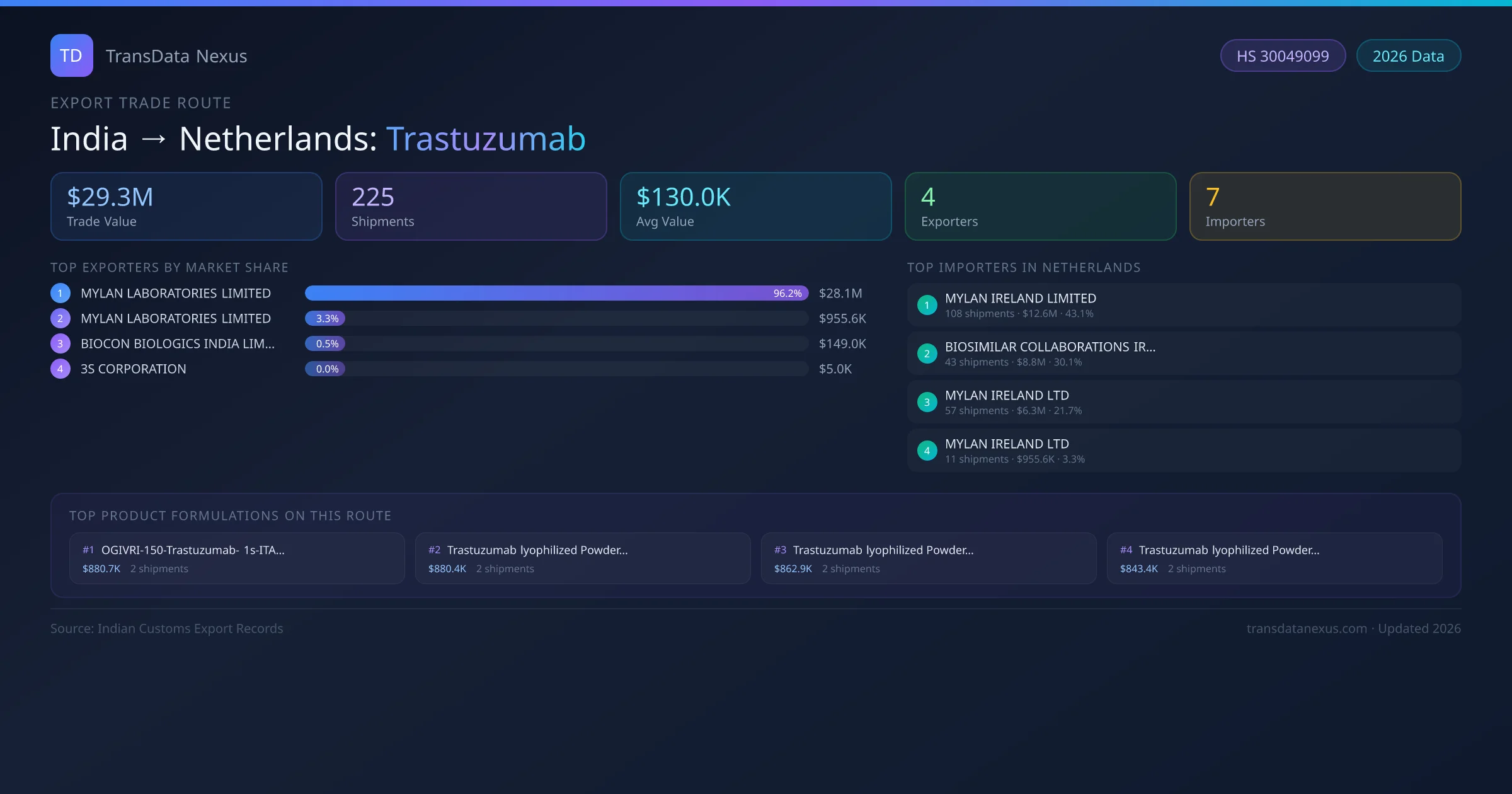 India has recorded 225 verified shipments of Trastuzumab exported to Netherlands, representing a combined trade value of $29.3M USD. This corridor is served by 4 active Indian exporters, with an average shipment value of $130.0K USD. The leading Indian exporter is MYLAN LABORATORIES LIMITED, which accounts for 96% of total export value with 211 shipments worth $28.1M USD. On the buying side, MYLAN IRELAND LIMITED is the largest importer in Netherlands with $12.6M USD in purchases. The top 3 suppliers — MYLAN LABORATORIES LIMITED, MYLAN LABORATORIES LIMITED , BIOCON BIOLOGICS INDIA LIMITED — together control 100% of total trade value on this route. All data sourced from Indian Customs (DGFT) shipping bill records. Values reported in FOB USD.