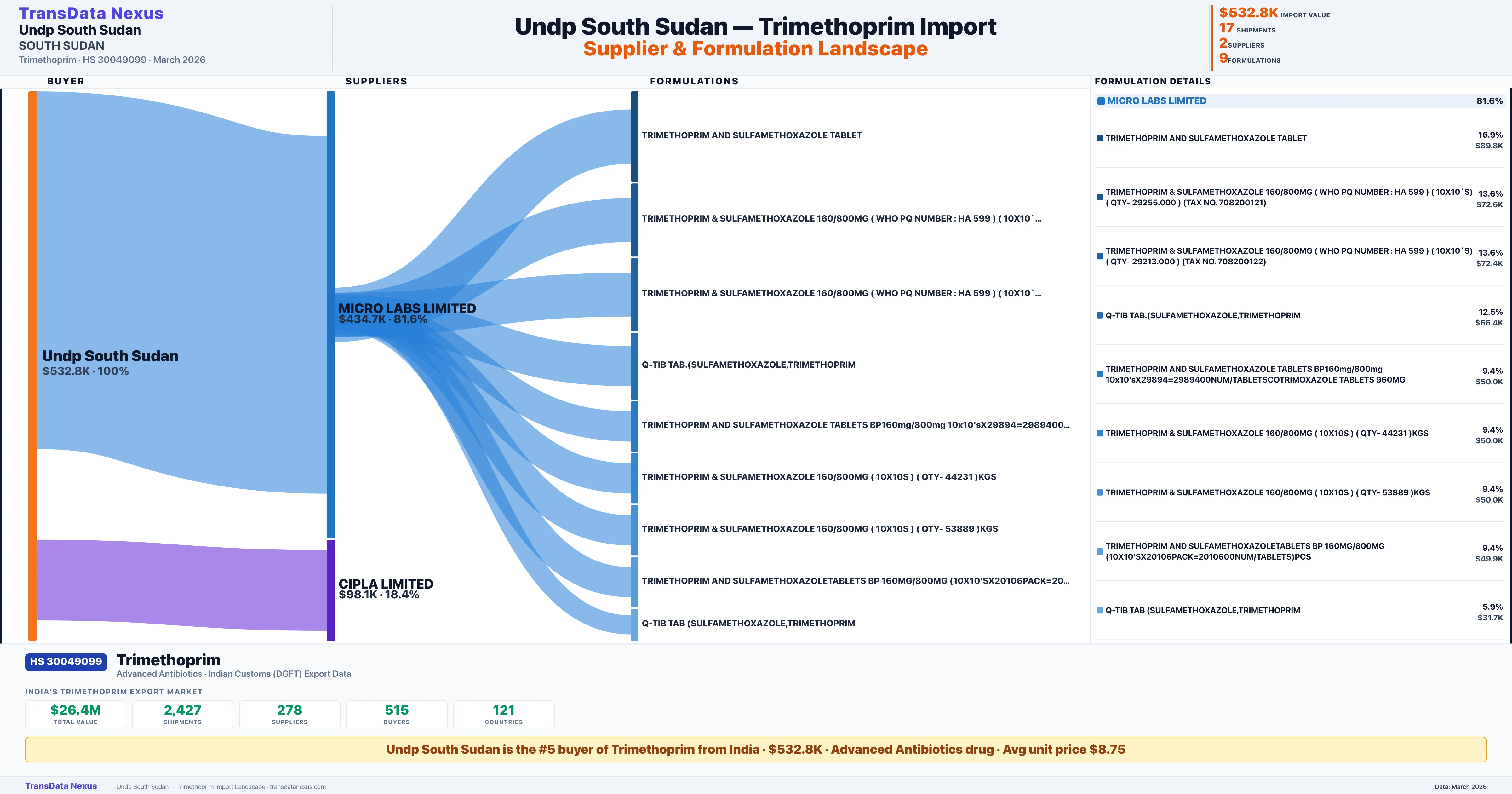 UNDP SOUTH SUDAN sources Trimethoprim from 2 verified Indian suppliers based on 17 customs records. The primary supplier is MICRO LABS LIMITED accounting for 81.6% of imports.