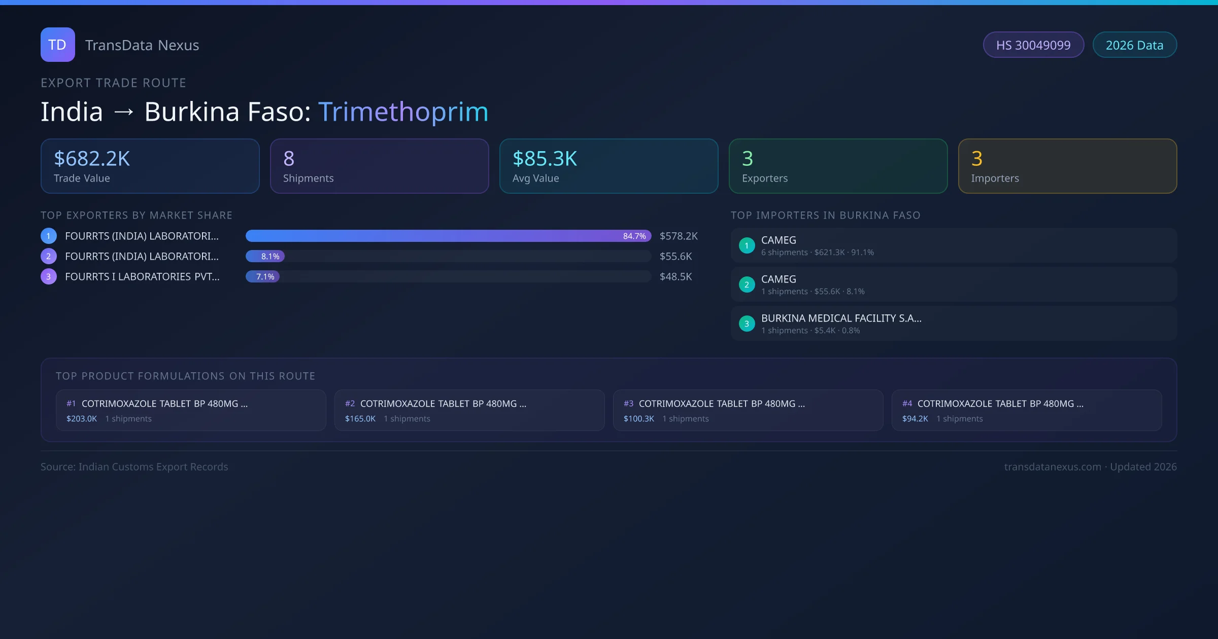 The India to Burkina Faso Trimethoprim corridor is one of India's established pharmaceutical export routes, with 8 shipments documented worth a combined $682.2K USD. The route is dominated by FOURRTS (INDIA) LABORATORIES PRIVATE LIMITED, which alone accounts for roughly 85% of all export value, reflecting the consolidated nature of India's trimethoprim manufacturing sector.