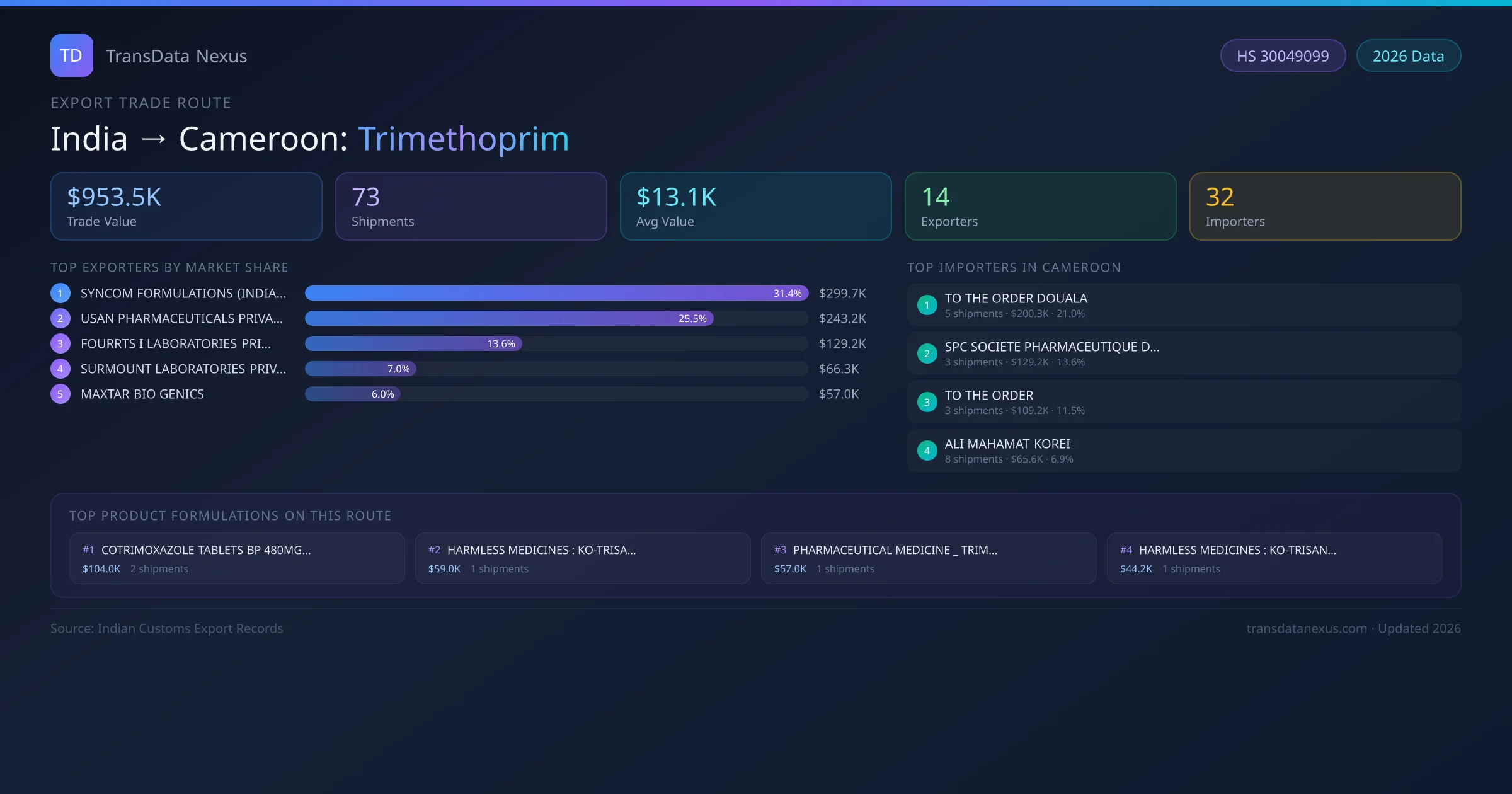 The India to Cameroon Trimethoprim corridor is one of India's established pharmaceutical export routes, with 73 shipments documented worth a combined $953.5K USD. The route is dominated by SYNCOM FORMULATIONS (INDIA) LIMITED, which alone accounts for roughly 31% of all export value, reflecting the consolidated nature of India's trimethoprim manufacturing sector.