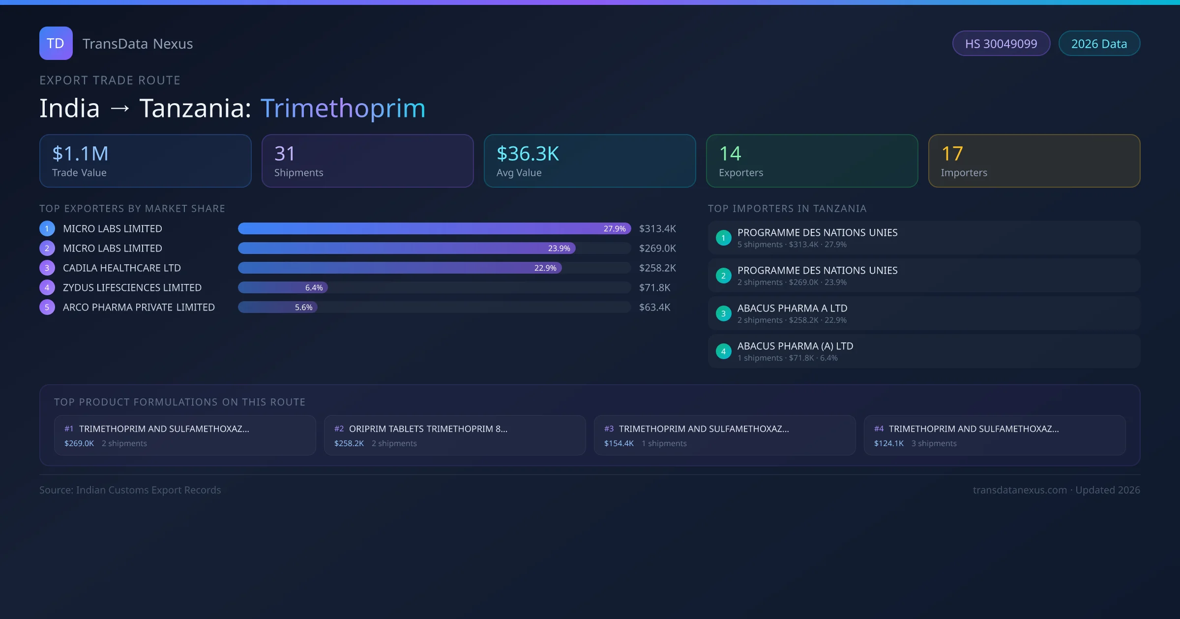 The leading Indian exporters of Trimethoprim to Tanzania are MICRO LABS LIMITED, MICRO LABS LIMITED , CADILA HEALTHCARE LTD. MICRO LABS LIMITED holds the largest market share at approximately 28% of total trade value on this route.
