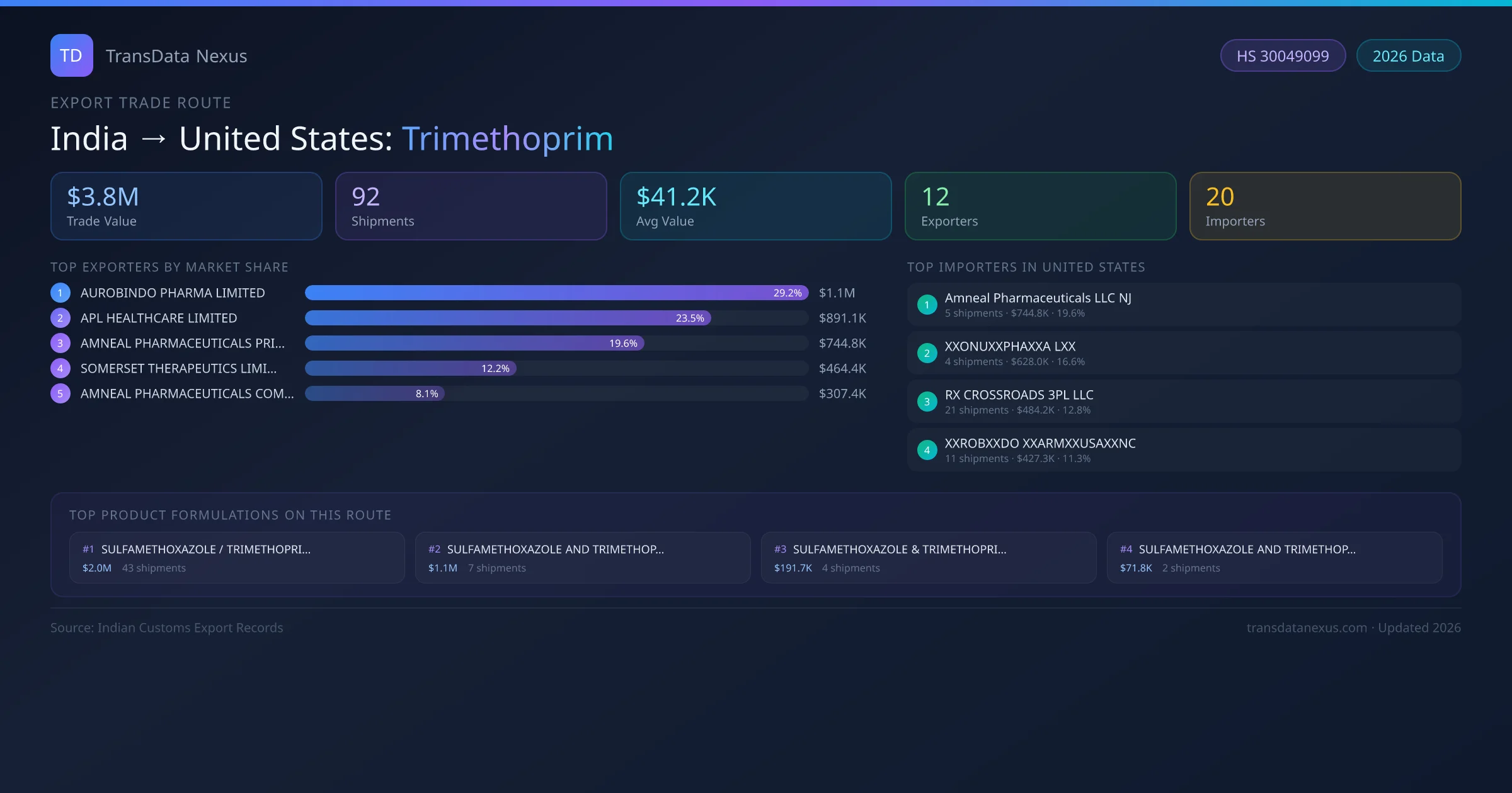 The India to United States Trimethoprim corridor is one of India's established pharmaceutical export routes, with 92 shipments documented worth a combined $3.8M USD. The route is dominated by AUROBINDO PHARMA LIMITED, which alone accounts for roughly 29% of all export value, reflecting the consolidated nature of India's trimethoprim manufacturing sector.
