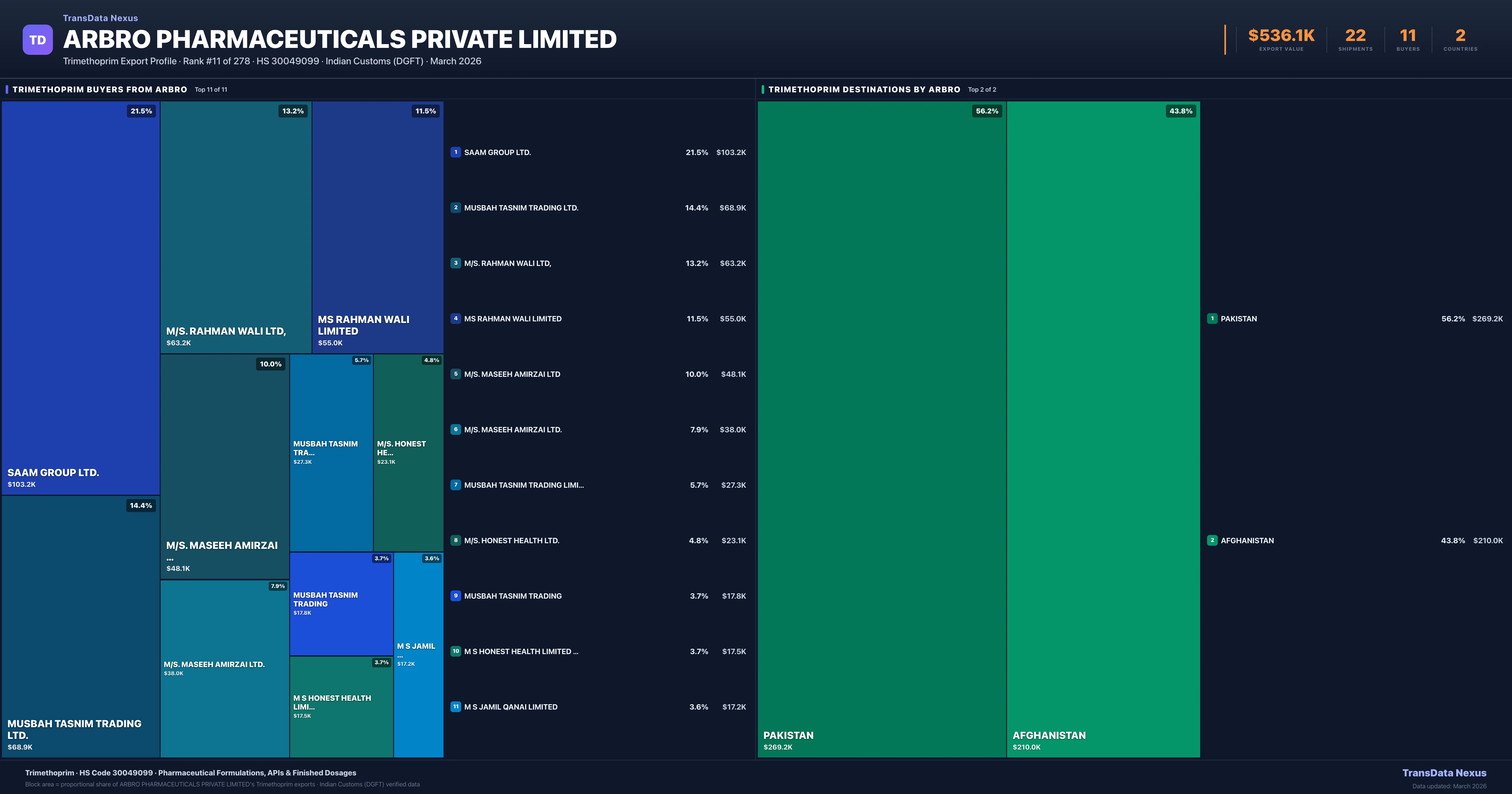 Arbro Pharmaceuticals Private Limited supplies Trimethoprim to 11 buyers globally. The largest buyer is SAAM GROUP LTD. (PAKISTAN), followed by MUSBAH TASNIM TRADING LTD. (PAKISTAN) and M/S. RAHMAN WALI LTD, (AFGHANISTAN). These buyers represent pharmaceutical distributors, hospital groups, and government procurement agencies in their respective markets.