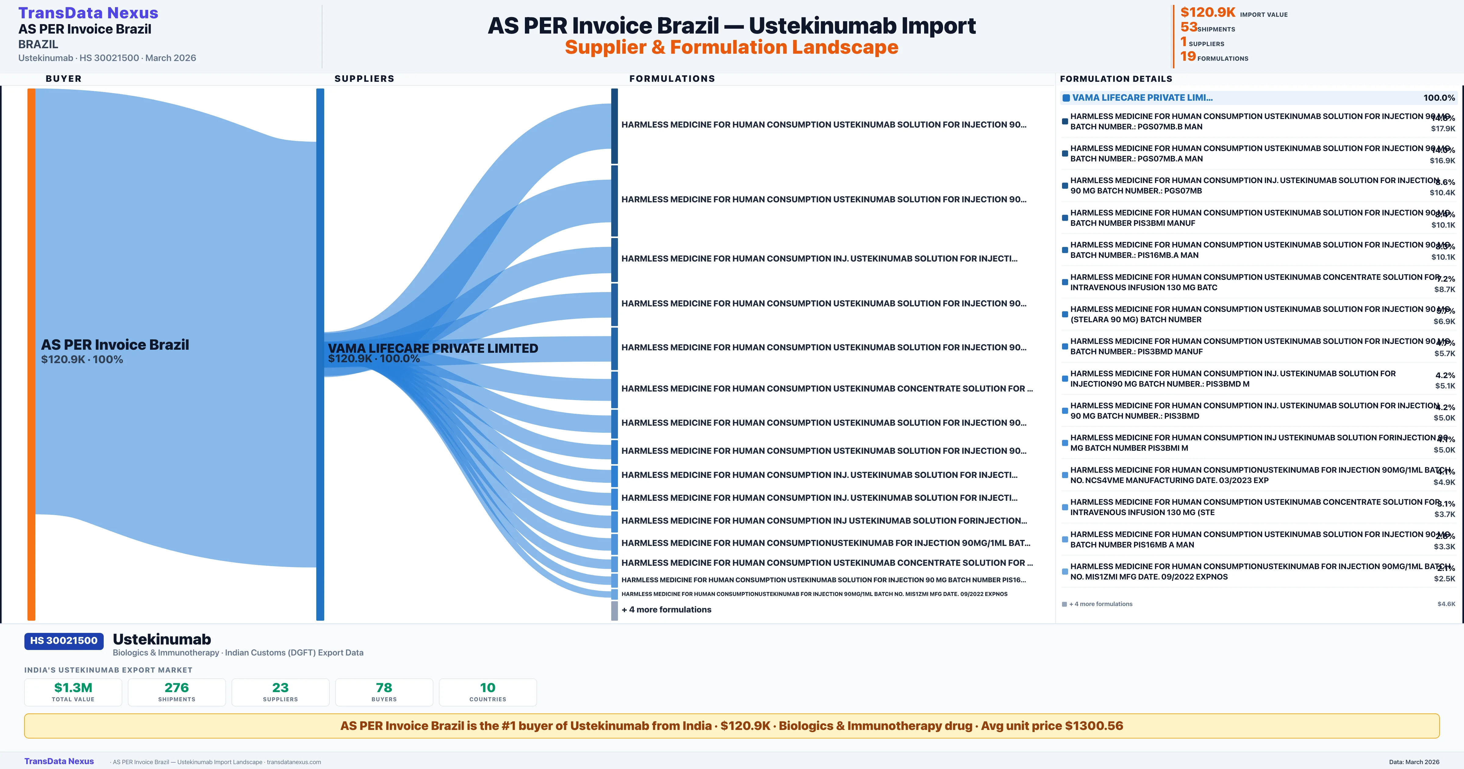 AS PER INVOICE BRAZIL sources Ustekinumab from 1 verified Indian supplier: VAMA LIFECARE PRIVATE LIMITED ($120.9K, 100.0%). This is based on 53 customs records.