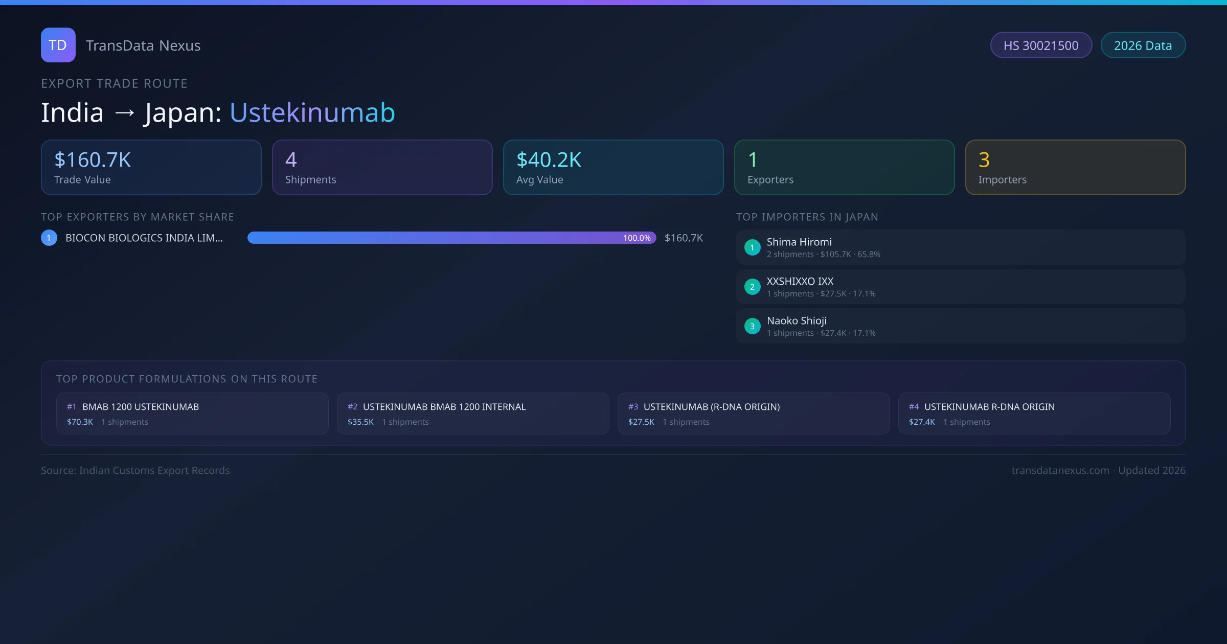 India has recorded 4 verified shipments of Ustekinumab exported to Japan, representing a combined trade value of $160.7K USD. This corridor is served by 1 active Indian exporters, with an average shipment value of $40.2K USD. The leading Indian exporter is BIOCON BIOLOGICS INDIA LIMITED, which accounts for 100% of total export value with 4 shipments worth $160.7K USD. On the buying side, Shima Hiromi is the largest importer in Japan with $105.7K USD in purchases. All data sourced from Indian Customs (DGFT) shipping bill records. Values reported in FOB USD.
