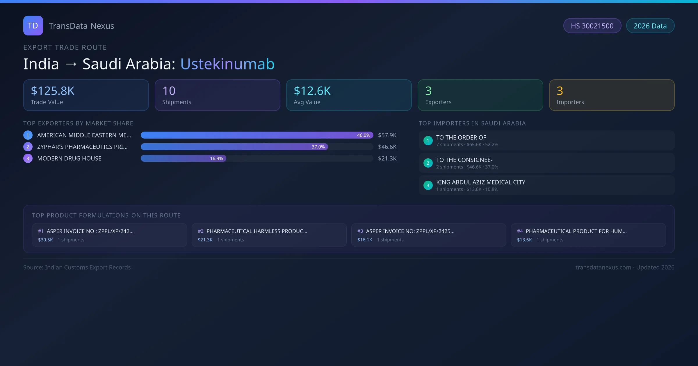 India has recorded 10 verified shipments of Ustekinumab exported to Saudi Arabia, representing a combined trade value of $125.8K USD. This corridor is served by 3 active Indian exporters, with an average shipment value of $12.6K USD. The leading Indian exporter is AMERICAN MIDDLE EASTERN MEDICAL SOLUTIONS PRIVATE, which accounts for 46% of total export value with 7 shipments worth $57.9K USD. On the buying side, TO THE ORDER OF is the largest importer in Saudi Arabia with $65.6K USD in purchases. The top 3 suppliers — AMERICAN MIDDLE EASTERN MEDICAL SOLUTIONS PRIVATE, ZYPHAR'S PHARMACEUTICS PRIVATE LIMITED, MODERN DRUG HOUSE — together control 100% of total trade value on this route. All data sourced from Indian Customs (DGFT) shipping bill records. Values reported in FOB USD.