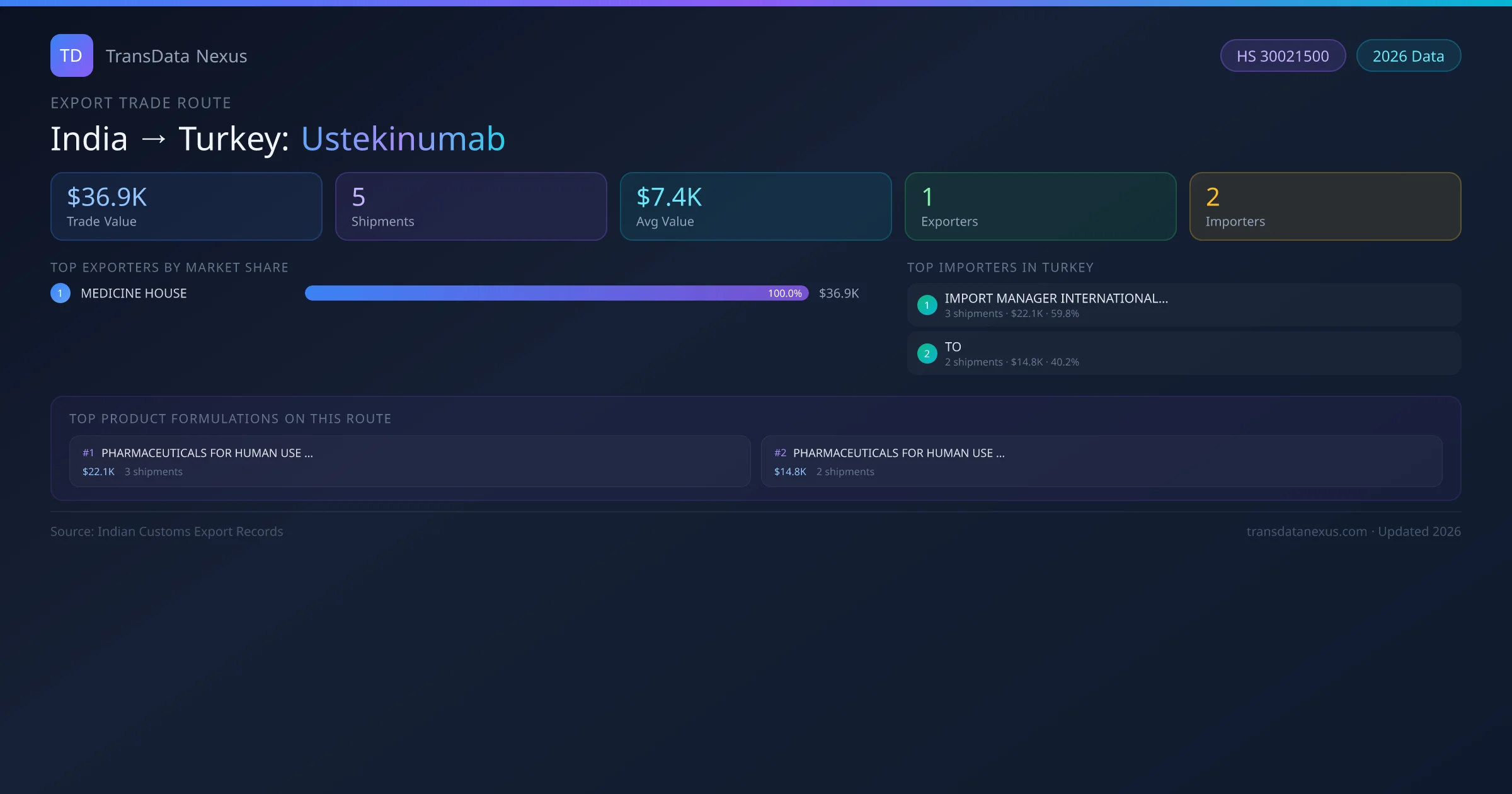 The India to Turkey Ustekinumab corridor is one of India's established pharmaceutical export routes, with 5 shipments documented worth a combined $36.9K USD. The route is dominated by MEDICINE HOUSE, which alone accounts for roughly 100% of all export value, reflecting the consolidated nature of India's ustekinumab manufacturing sector.