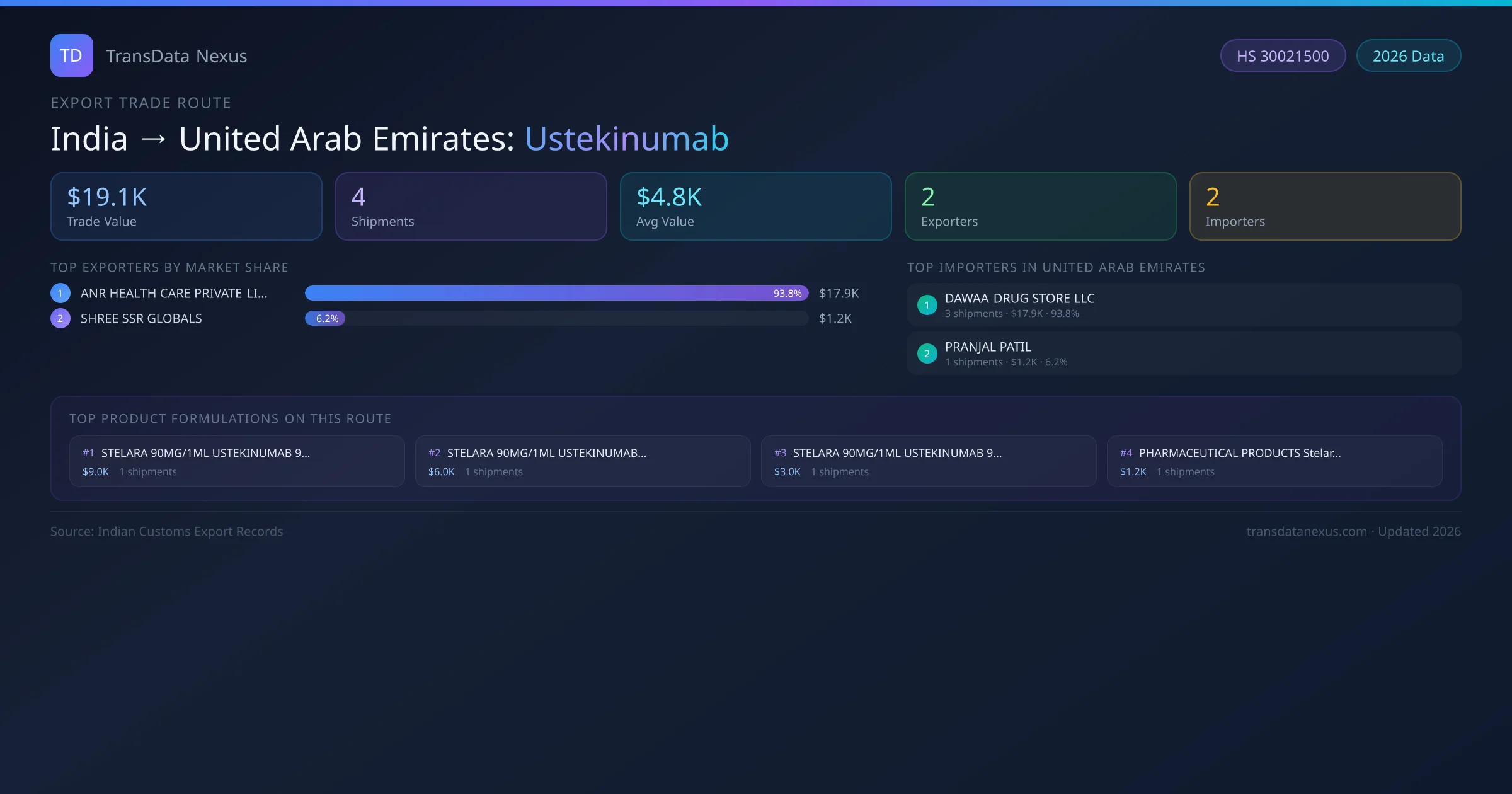 India has recorded 4 verified shipments of Ustekinumab exported to United Arab Emirates, representing a combined trade value of $19.1K USD. This corridor is served by 2 active Indian exporters, with an average shipment value of $4.8K USD. The leading Indian exporter is ANR HEALTH CARE PRIVATE LIMITED, which accounts for 94% of total export value with 3 shipments worth $17.9K USD. On the buying side, DAWAA DRUG STORE LLC is the largest importer in United Arab Emirates with $17.9K USD in purchases. All data sourced from Indian Customs (DGFT) shipping bill records. Values reported in FOB USD.