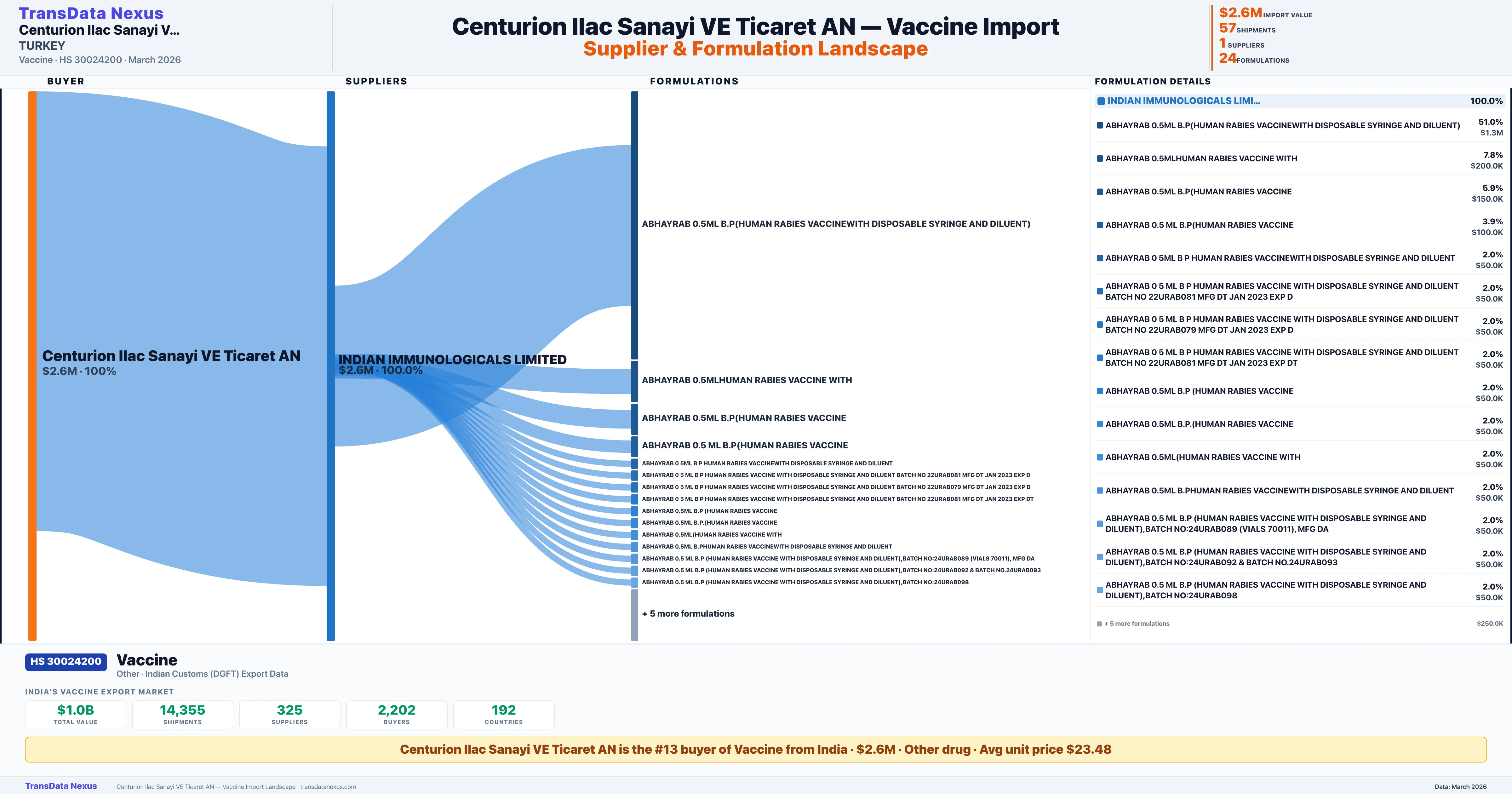 CENTURION ILAC SANAYI VE TICARET AN sources Vaccine from 1 verified Indian supplier: INDIAN IMMUNOLOGICALS LIMITED ($2.6M, 100.0%). This is based on 57 customs records.