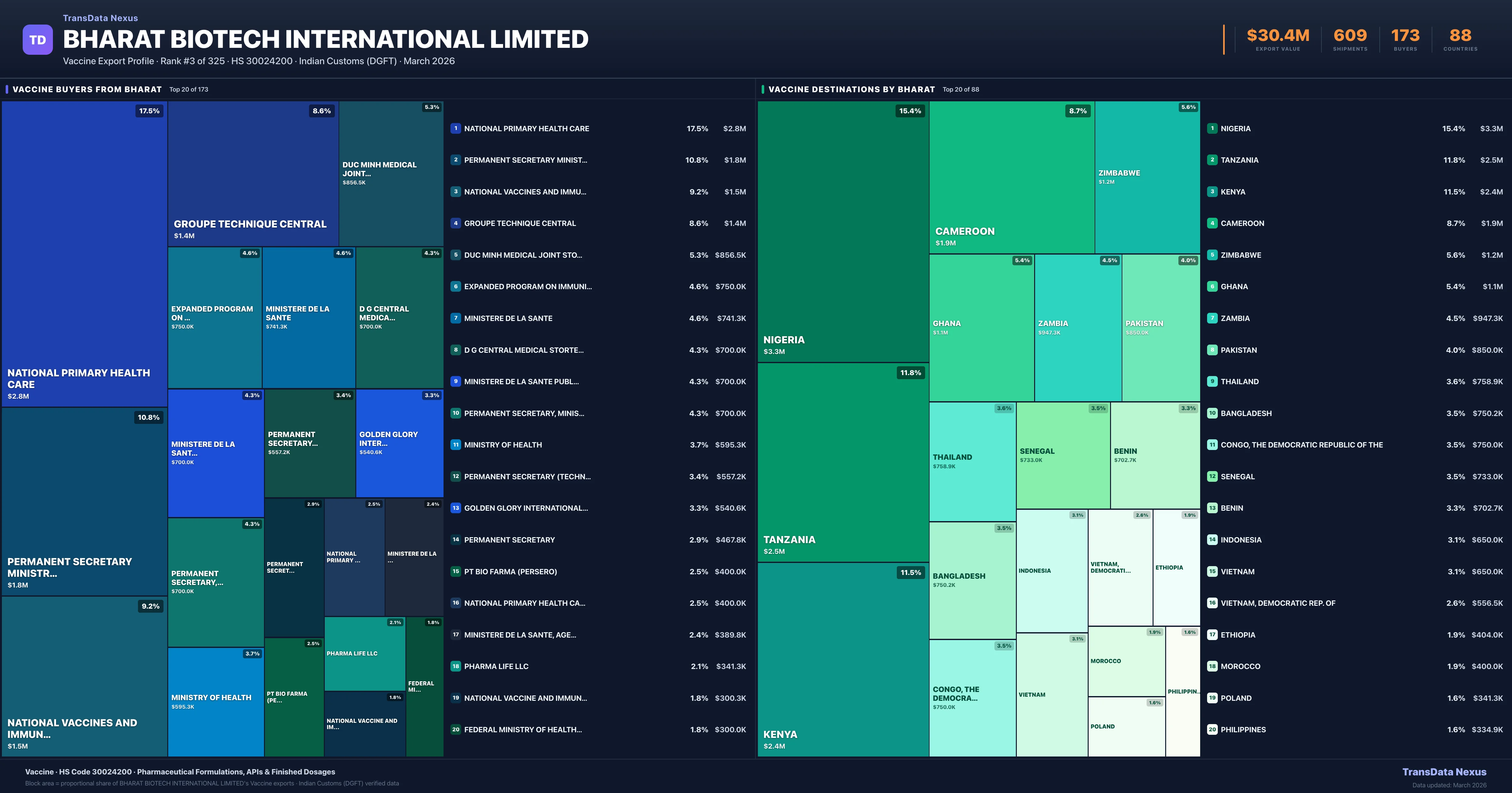 Bharat Biotech International Limited supplies Vaccine to 173 buyers globally. The largest buyer is NATIONAL PRIMARY HEALTH CARE (NIGERIA), followed by PERMANENT SECRETARY MINISTRY OF (TANZANIA) and NATIONAL VACCINES AND IMMUNIZATION (KENYA). These buyers represent pharmaceutical distributors, hospital groups, and government procurement agencies in their respective markets.