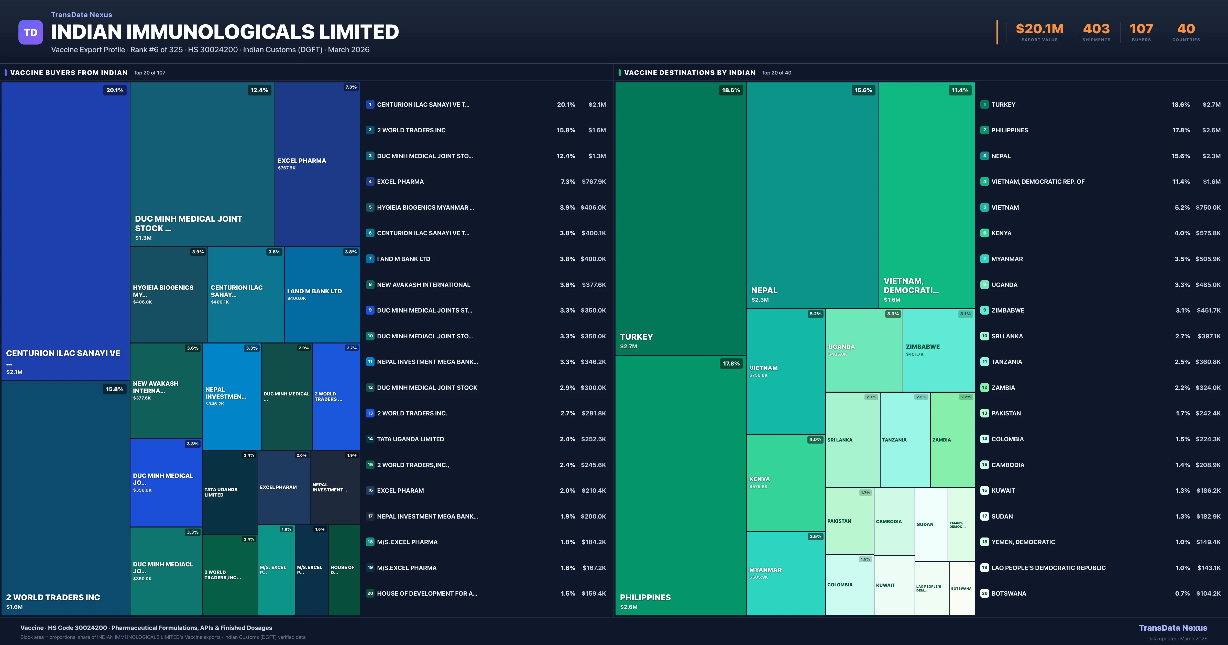 Access shipment-level details, pricing data, buyer connections, and competitive analysis for Indian Immunologicals Limited's Vaccine exports. TransData Nexus provides verified Indian Customs (DGFT) data trusted by pharmaceutical trade professionals worldwide.
