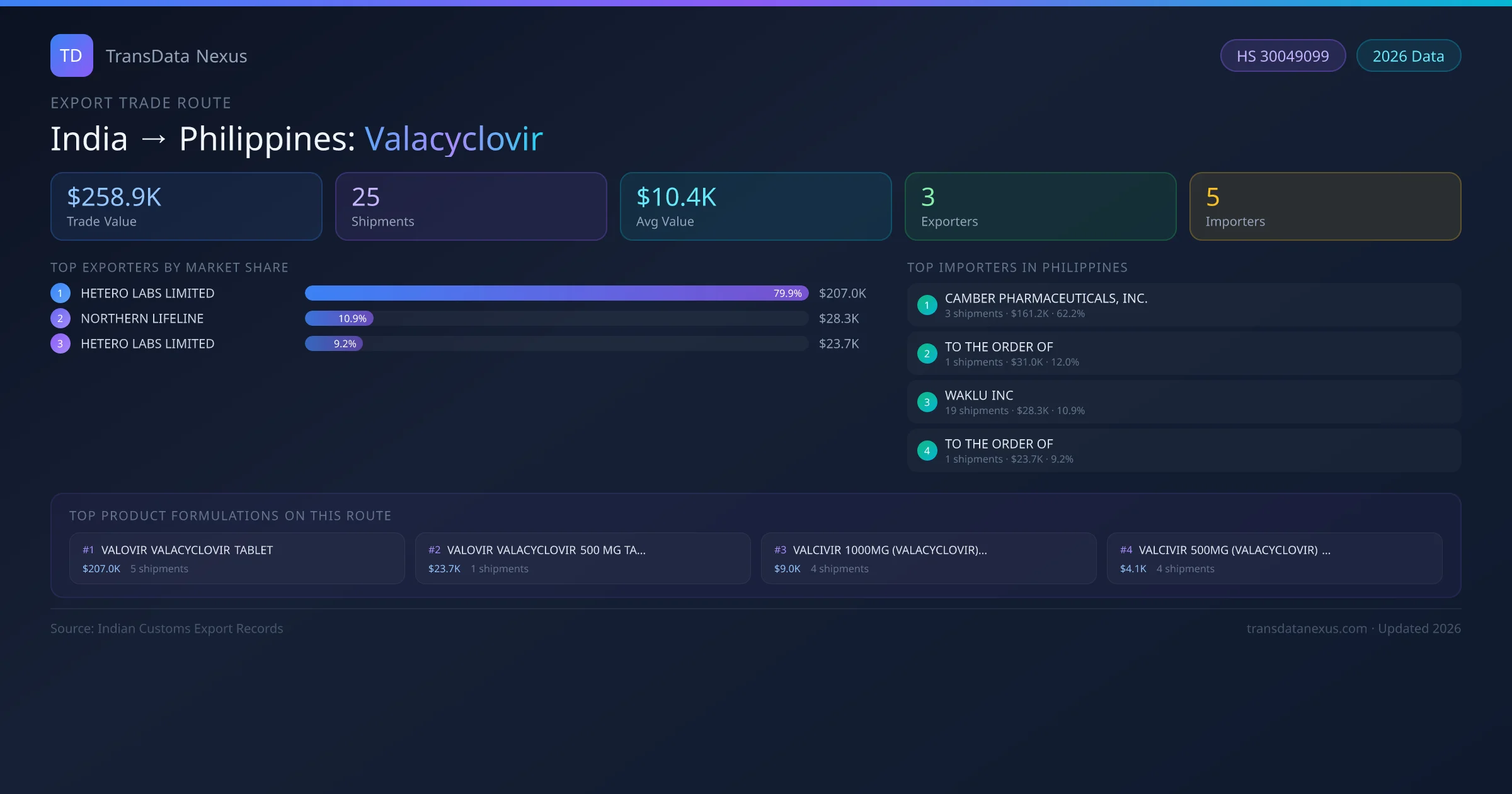 India has recorded 25 verified shipments of Valacyclovir exported to Philippines, representing a combined trade value of $258.9K USD. This corridor is served by 3 active Indian exporters, with an average shipment value of $10.4K USD. The leading Indian exporter is HETERO LABS LIMITED, which accounts for 80% of total export value with 5 shipments worth $207.0K USD. On the buying side, CAMBER PHARMACEUTICALS, INC. is the largest importer in Philippines with $161.2K USD in purchases. The top 3 suppliers — HETERO LABS LIMITED, NORTHERN LIFELINE, HETERO LABS LIMITED — together control 100% of total trade value on this route. All data sourced from Indian Customs (DGFT) shipping bill records. Values reported in FOB USD.