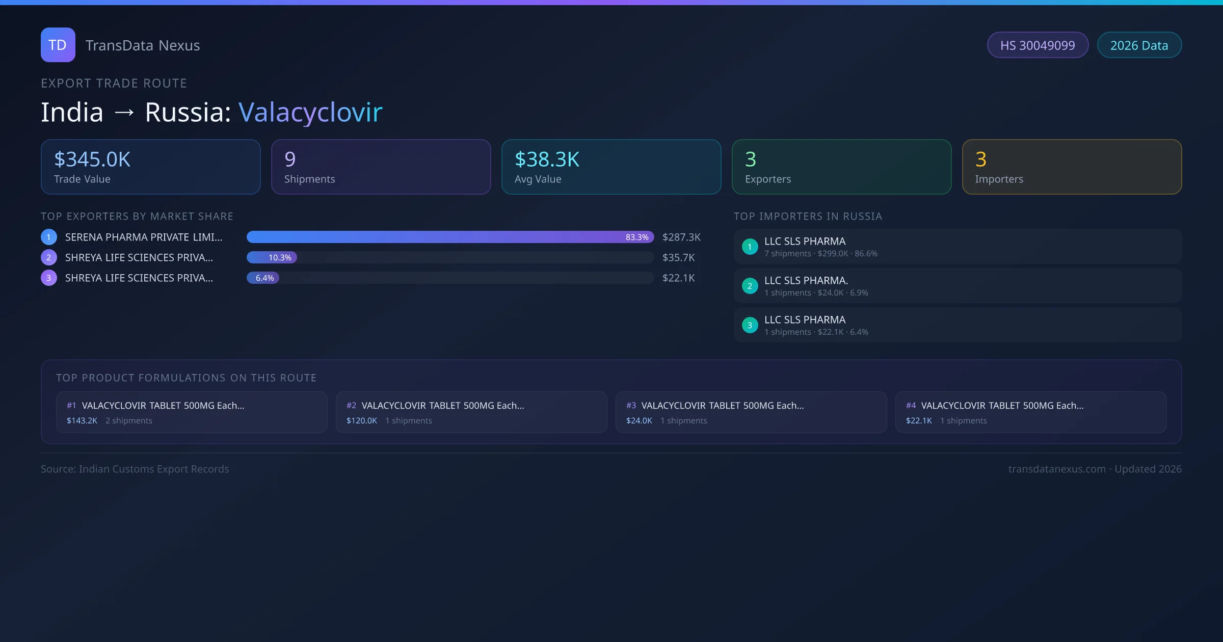 India has recorded 9 verified shipments of Valacyclovir exported to Russia, representing a combined trade value of $345.0K USD. This corridor is served by 3 active Indian exporters, with an average shipment value of $38.3K USD. The leading Indian exporter is SERENA PHARMA PRIVATE LIMITED, which accounts for 83% of total export value with 4 shipments worth $287.3K USD. On the buying side, LLC SLS PHARMA is the largest importer in Russia with $299.0K USD in purchases. The top 3 suppliers — SERENA PHARMA PRIVATE LIMITED, SHREYA LIFE SCIENCES PRIVATE LIMITED, SHREYA LIFE SCIENCES PRIVATE LIMITED — together control 100% of total trade value on this route. All data sourced from Indian Customs (DGFT) shipping bill records. Values reported in FOB USD.