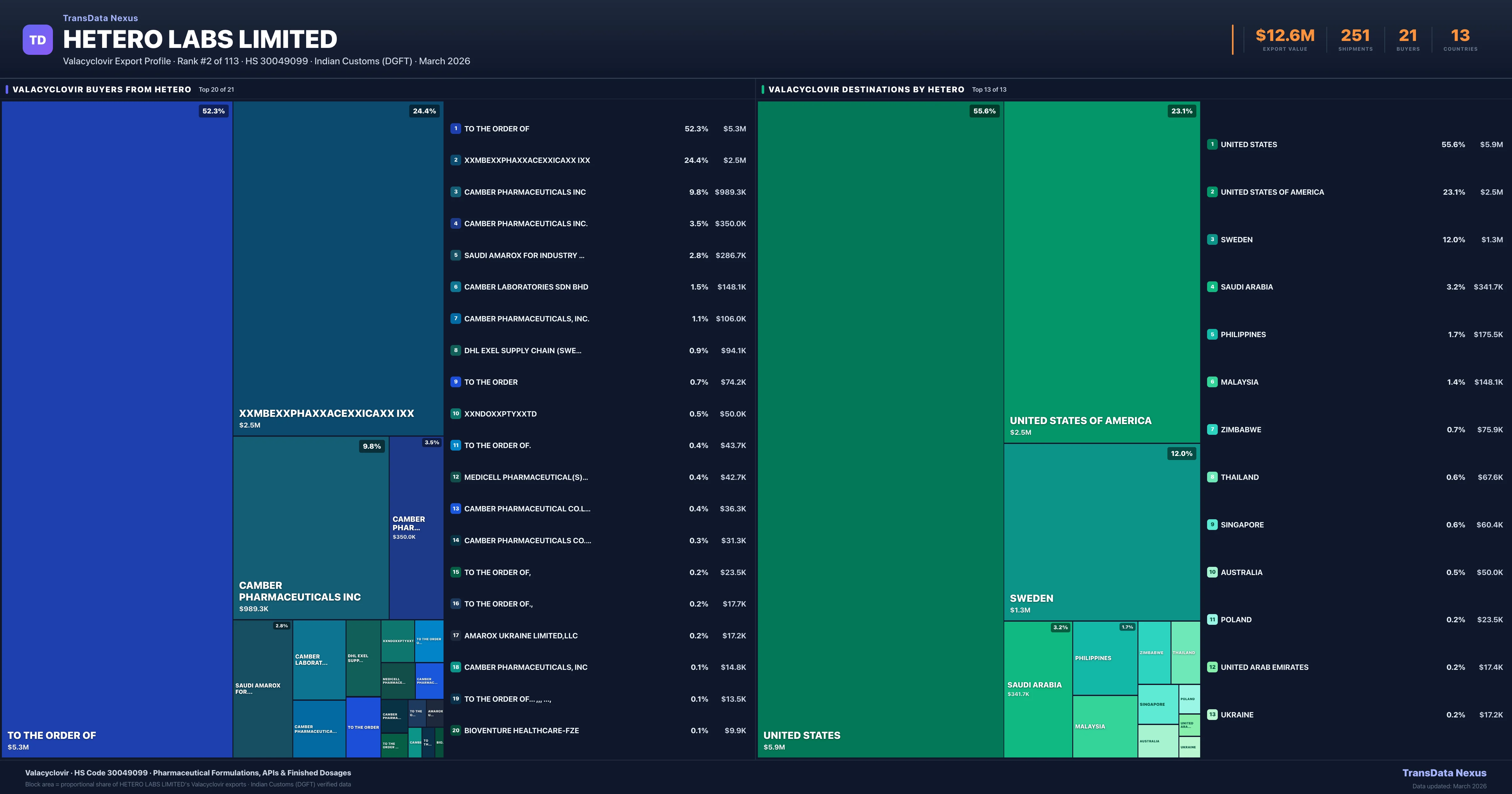 Hetero Labs Limited supplies Valacyclovir to 21 buyers globally. The largest buyer is TO THE ORDER OF (SWEDEN), followed by XXMBEXXPHAXXACEXXICAXX IXX (UNITED STATES OF AMERICA) and CAMBER PHARMACEUTICALS INC (UNITED STATES). These buyers represent pharmaceutical distributors, hospital groups, and government procurement agencies in their respective markets.