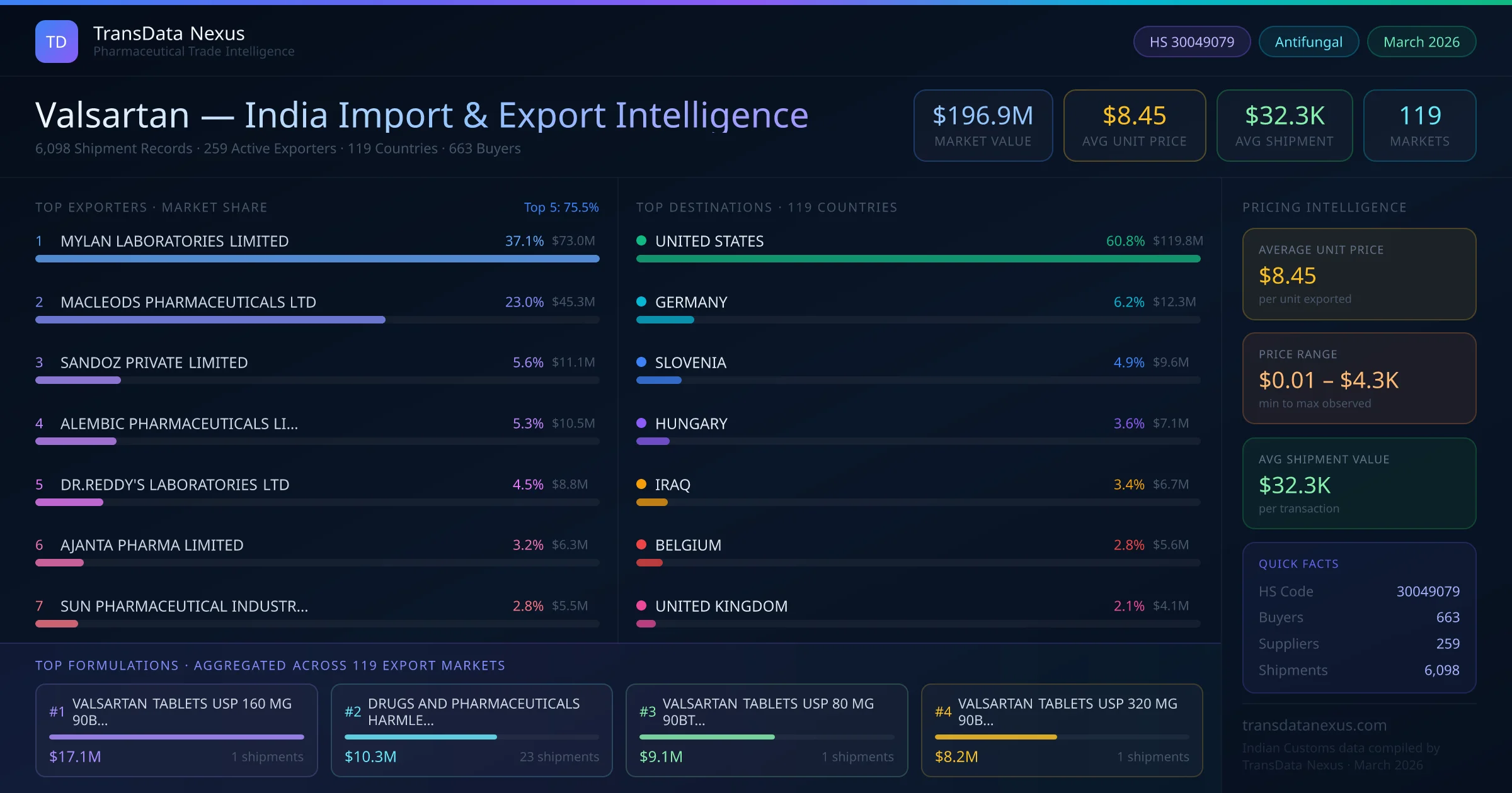 Between 2022 and 2026, India exported $196.9M worth of valsartan across 6,098 verified shipments to 119 countries — covering 61% of world markets in the Cardiovascular segment. The largest destination is UNITED STATES (60.8%). MYLAN LABORATORIES LIMITED leads with a 37.1% share. All figures are drawn from Indian Customs (DGFT) shipping bill records spanning four years of trade activity.