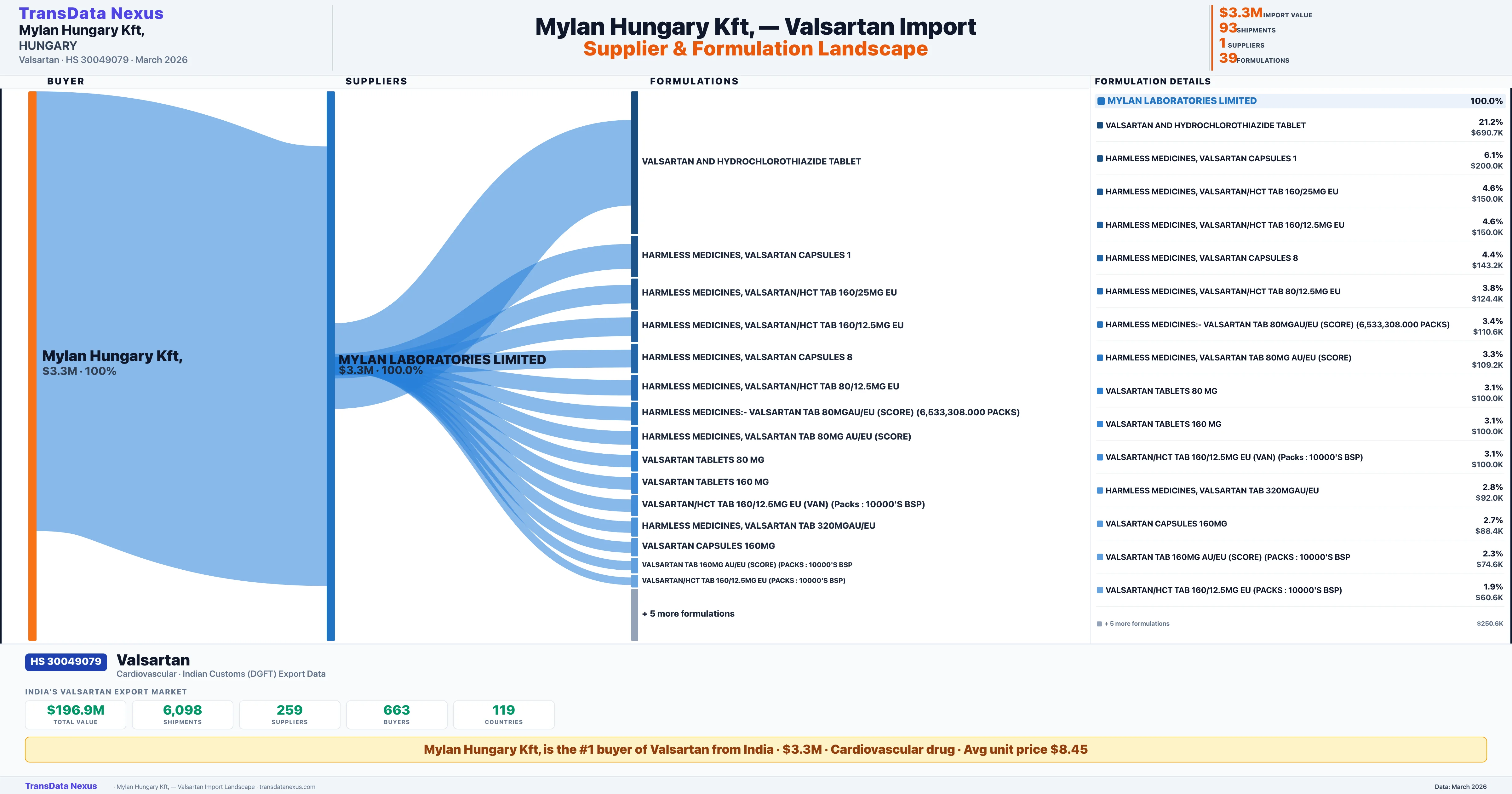 MYLAN HUNGARY KFT, sources Valsartan from 1 verified Indian supplier: MYLAN LABORATORIES LIMITED ($3.3M, 100.0%). This is based on 93 customs records.