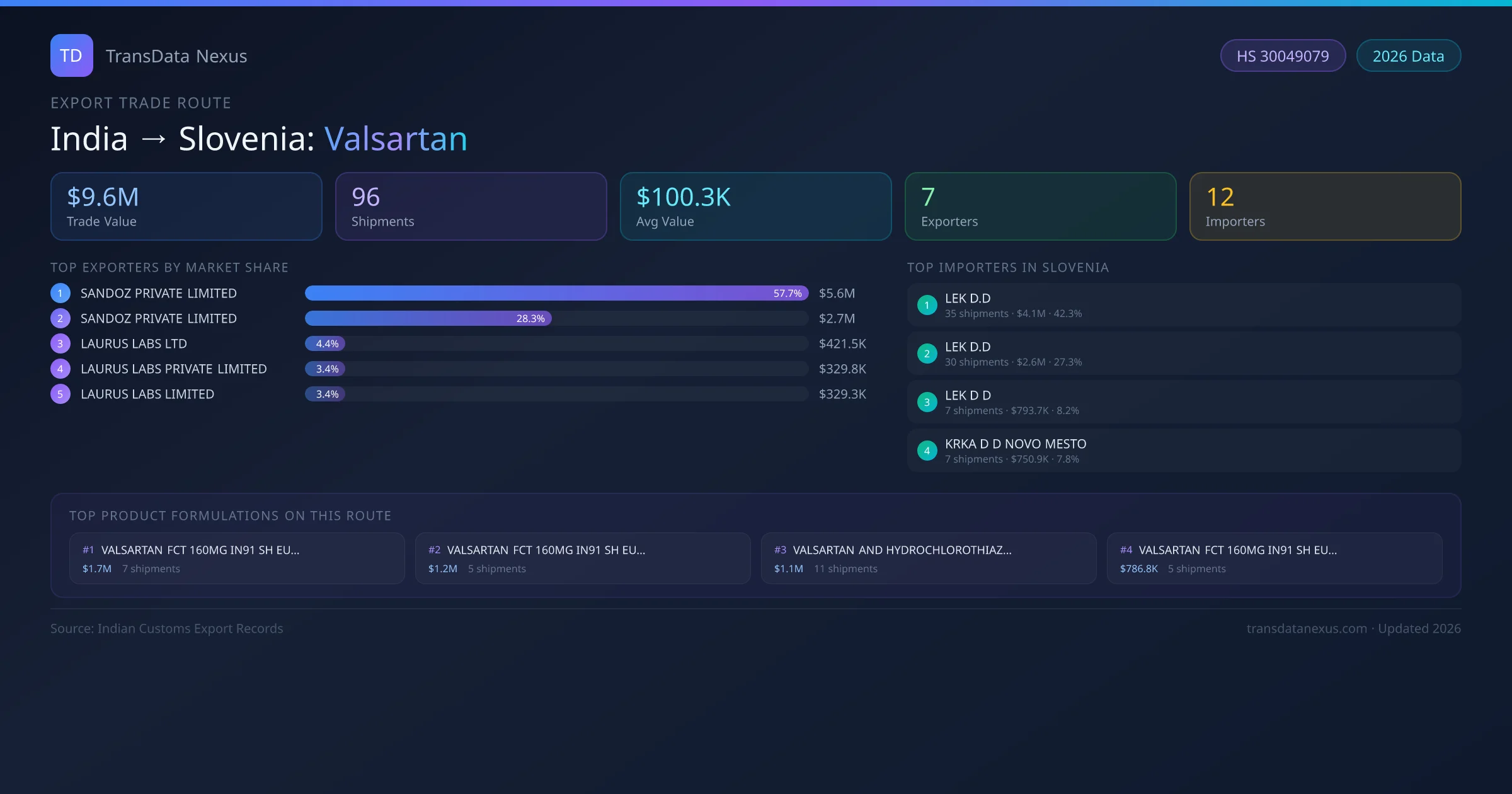 India has recorded 96 verified shipments of Valsartan exported to Slovenia, representing a combined trade value of $9.6M USD. This corridor is served by 7 active Indian exporters, with an average shipment value of $100.3K USD. The leading Indian exporter is SANDOZ PRIVATE LIMITED, which accounts for 58% of total export value with 49 shipments worth $5.6M USD. On the buying side, LEK D.D is the largest importer in Slovenia with $4.1M USD in purchases. The top 3 suppliers — SANDOZ PRIVATE LIMITED, SANDOZ PRIVATE LIMITED , LAURUS LABS LTD — together control 90% of total trade value on this route. All data sourced from Indian Customs (DGFT) shipping bill records. Values reported in FOB USD.